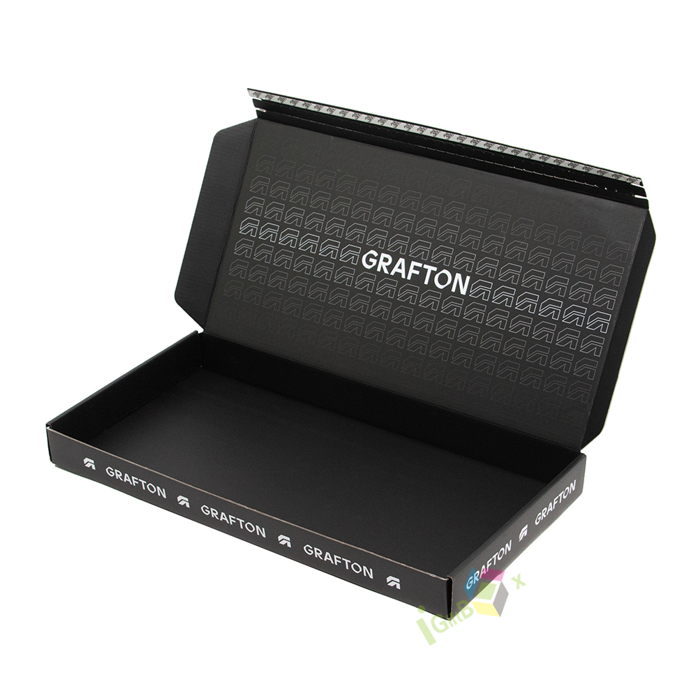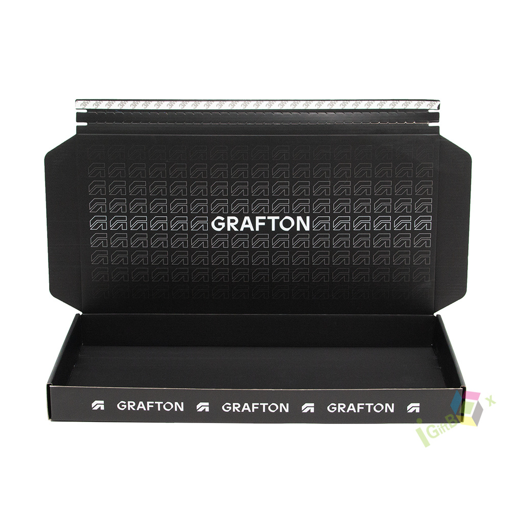This matte black corrugated shipping box features a convenient easy-tear adhesive tape closure, allowing customers to open the package without scissors for a hassle-free unboxing experience. Crafted from sturdy corrugated cardboard, it offers reliable protection for products during transit, while the custom logo printed branding and subtle pattern on the interior and exterior deliver a cohesive, professional look. The self-seal design eliminates the need for extra packaging tape, making it ideal for e-commerce shipping, subscription boxes, or direct-to-consumer retail.