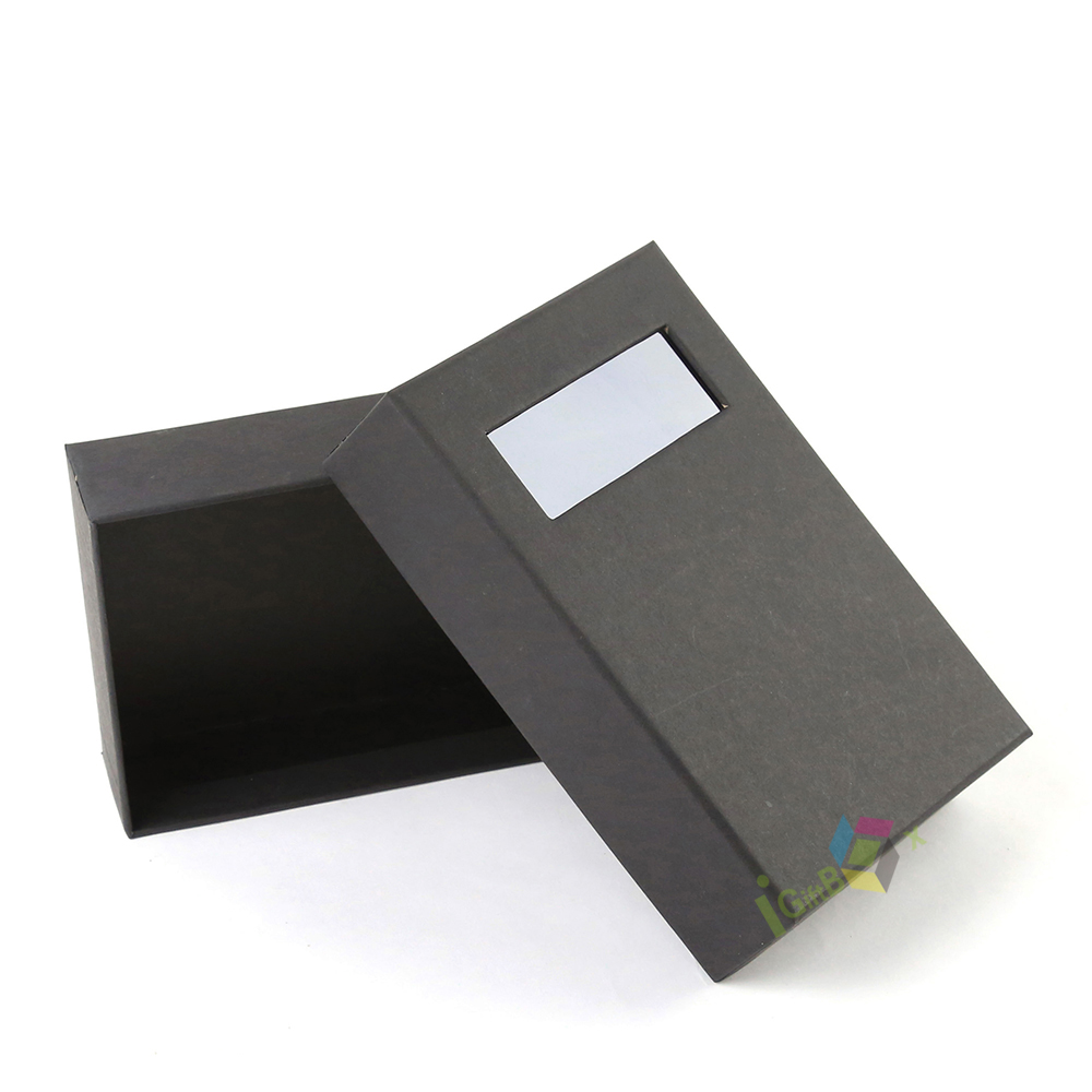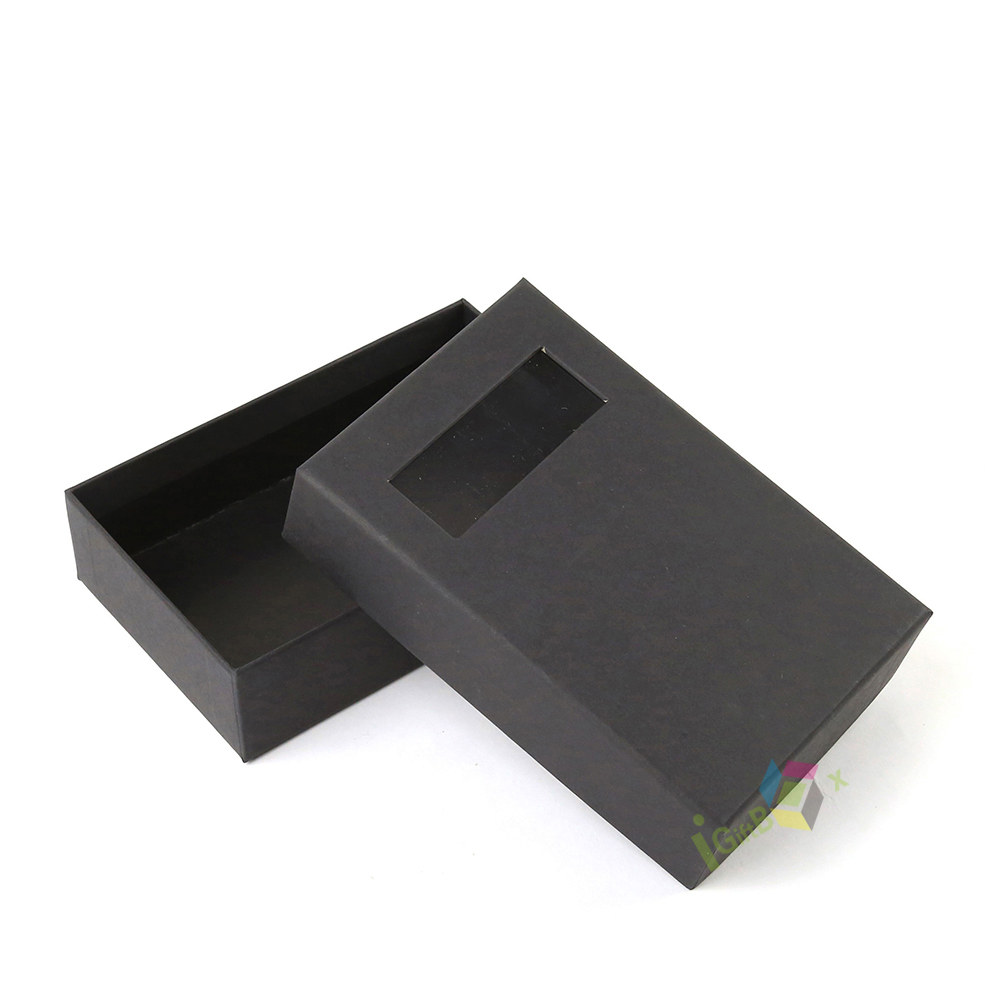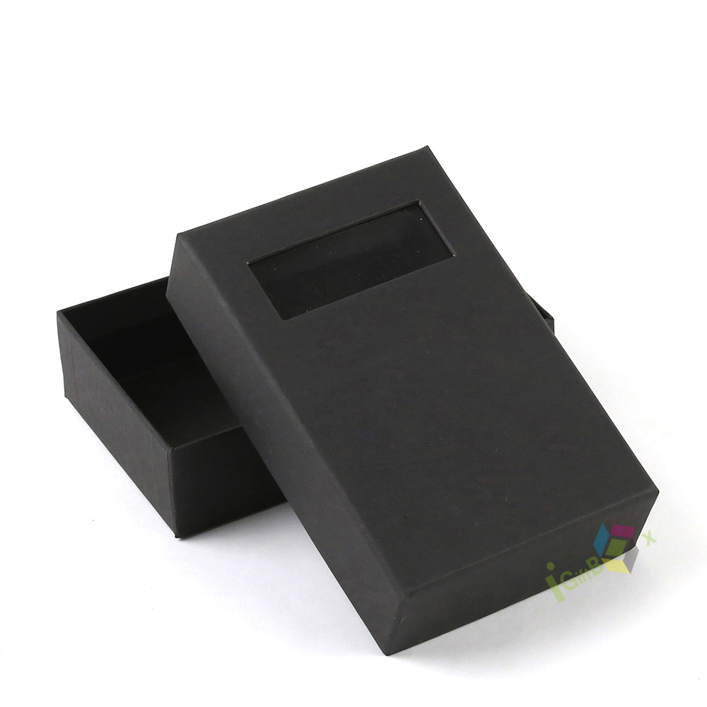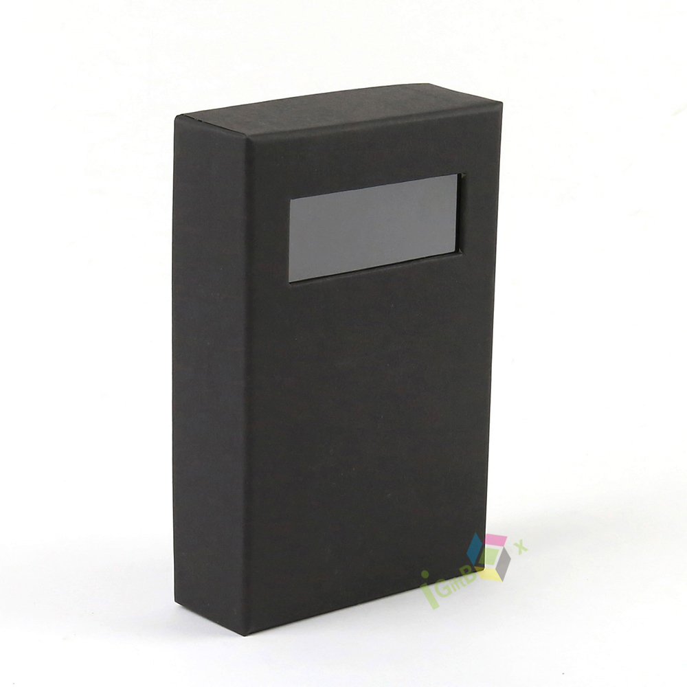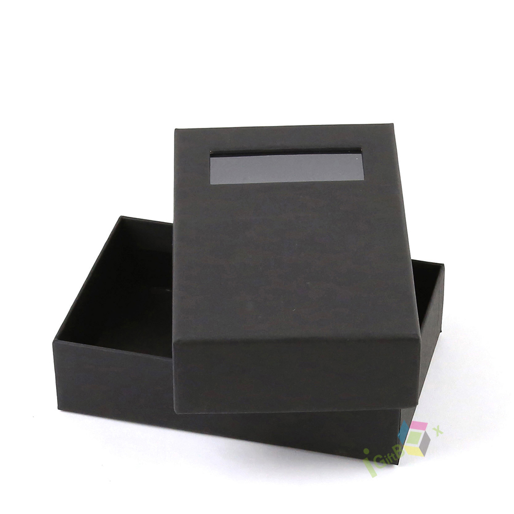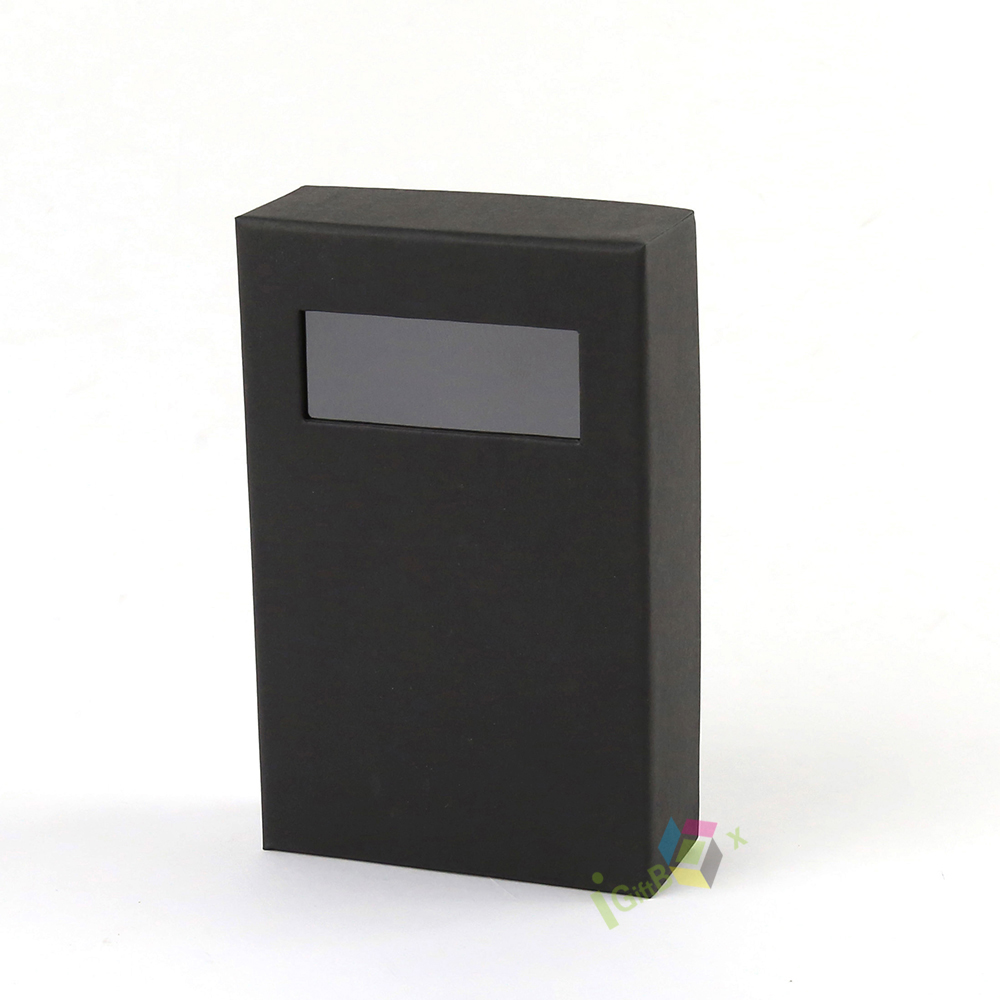 Minimalist black kraft paper drawer box with a clear window cutout on the sliding lid, allowing for product display while maintaining a sleek, professional look. The smooth matte black finish and sturdy construction make it ideal for small retail items, cosmetics, jewelry, and specialty gifts. Its compact design and easy-slide mechanism ensure secure storage and a premium unboxing experience.