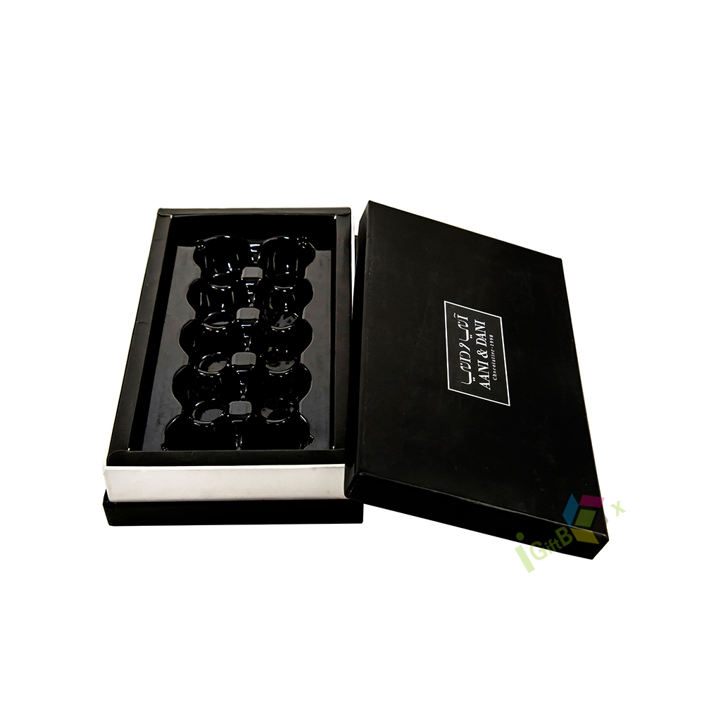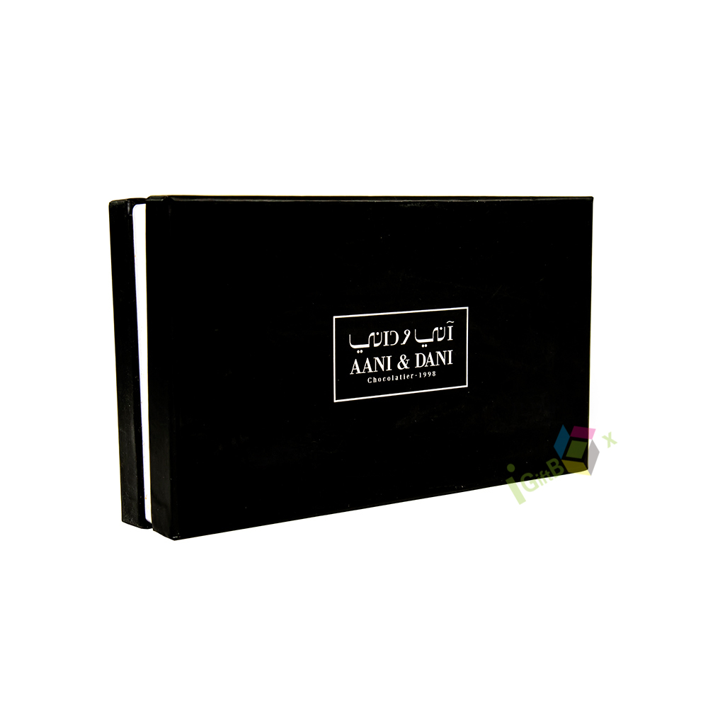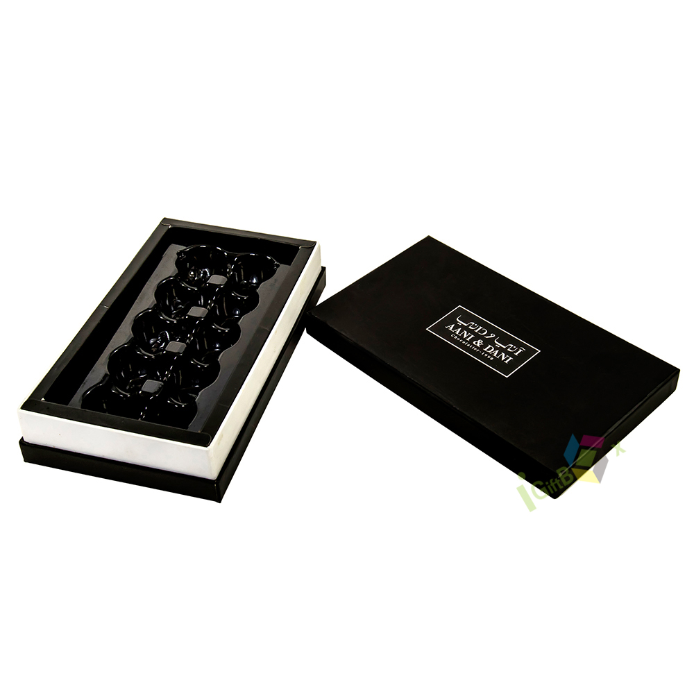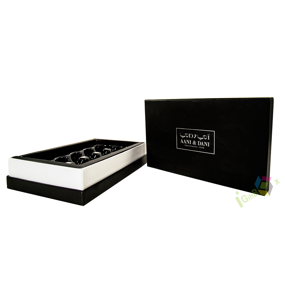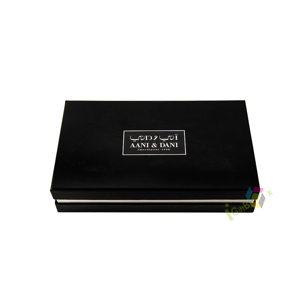 Premium rigid chocolate gift box with a sleek matte black finish and custom-cut foam insert to securely hold chocolates or truffles. The lid features a subtle debossed logo for a sophisticated, high-end look, while the sturdy construction ensures protection for delicate treats. The minimalist design, with a contrasting black-and-white edge detail, conveys luxury and elegance, making it ideal for confectionery gifts, corporate favors, and special occasions.