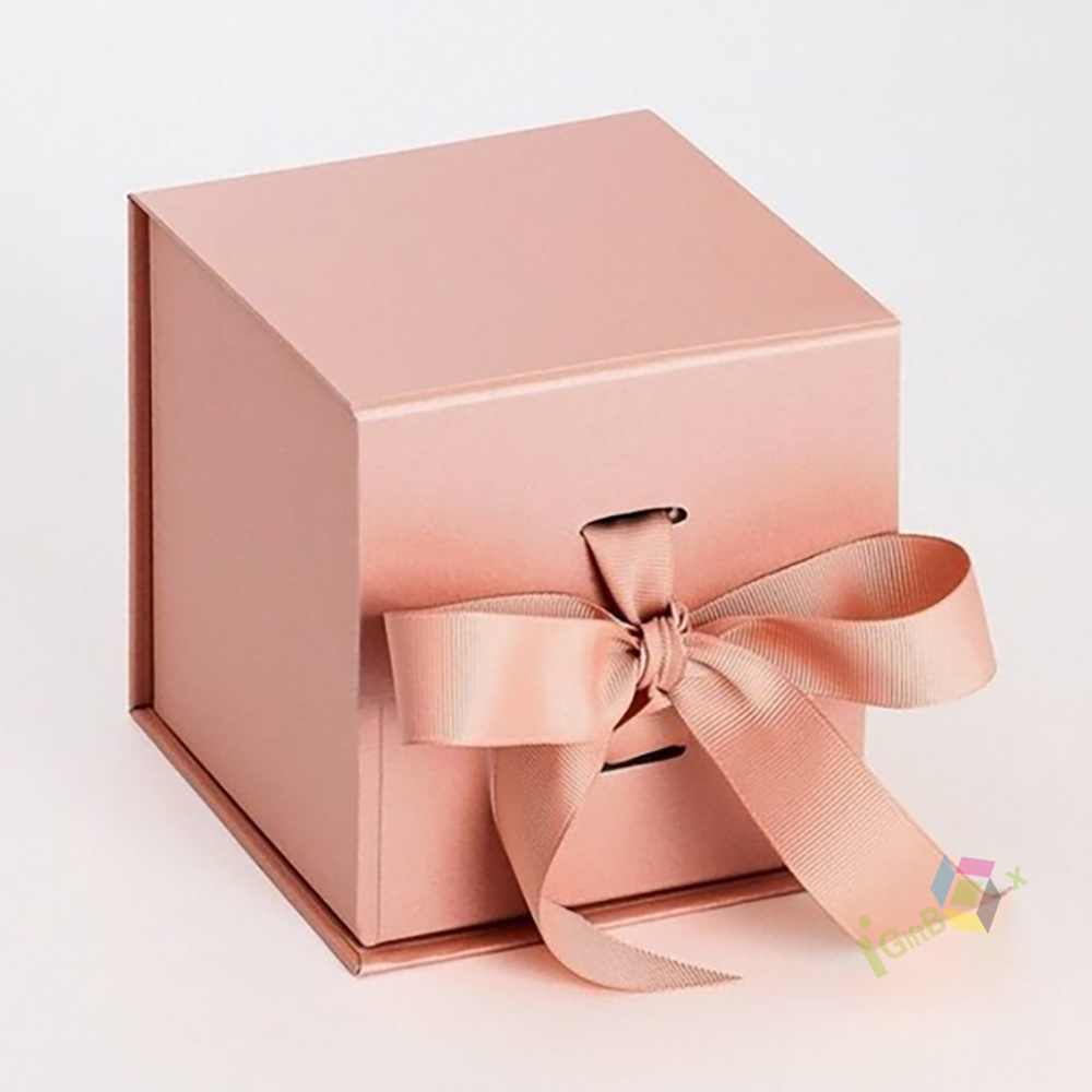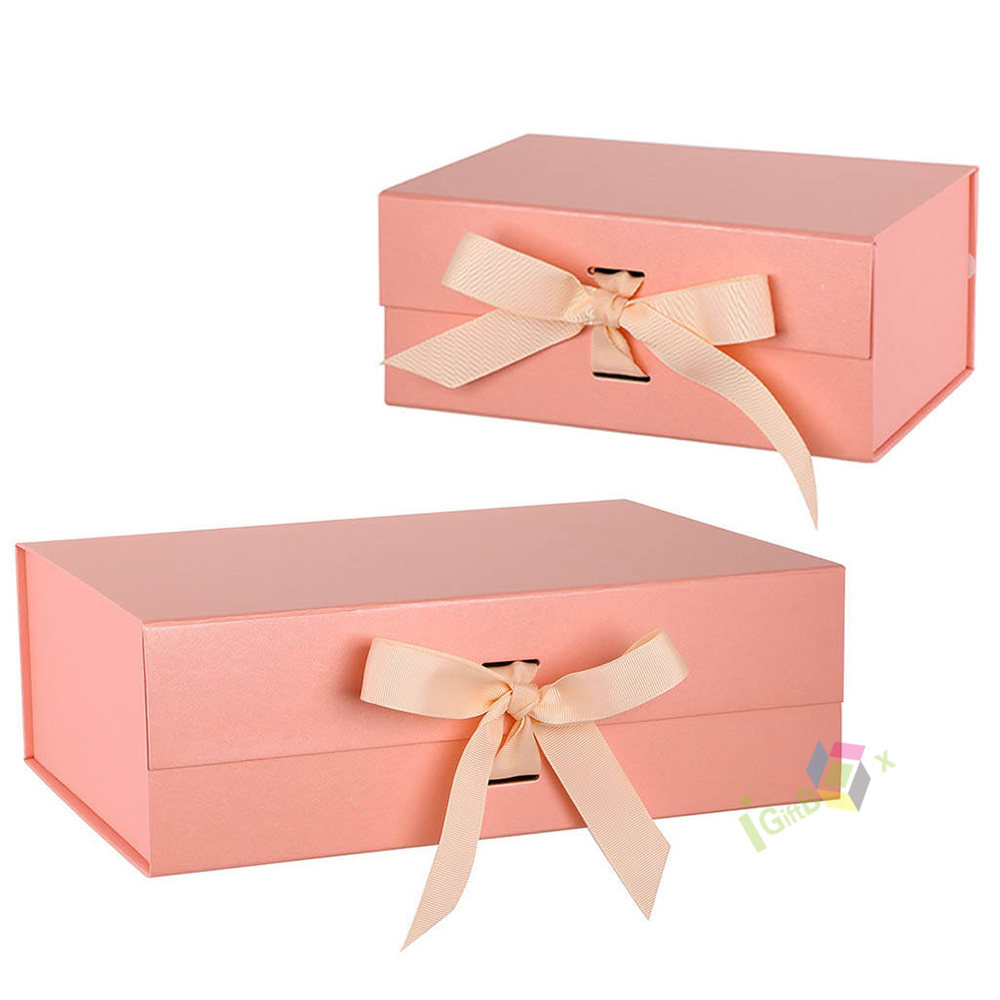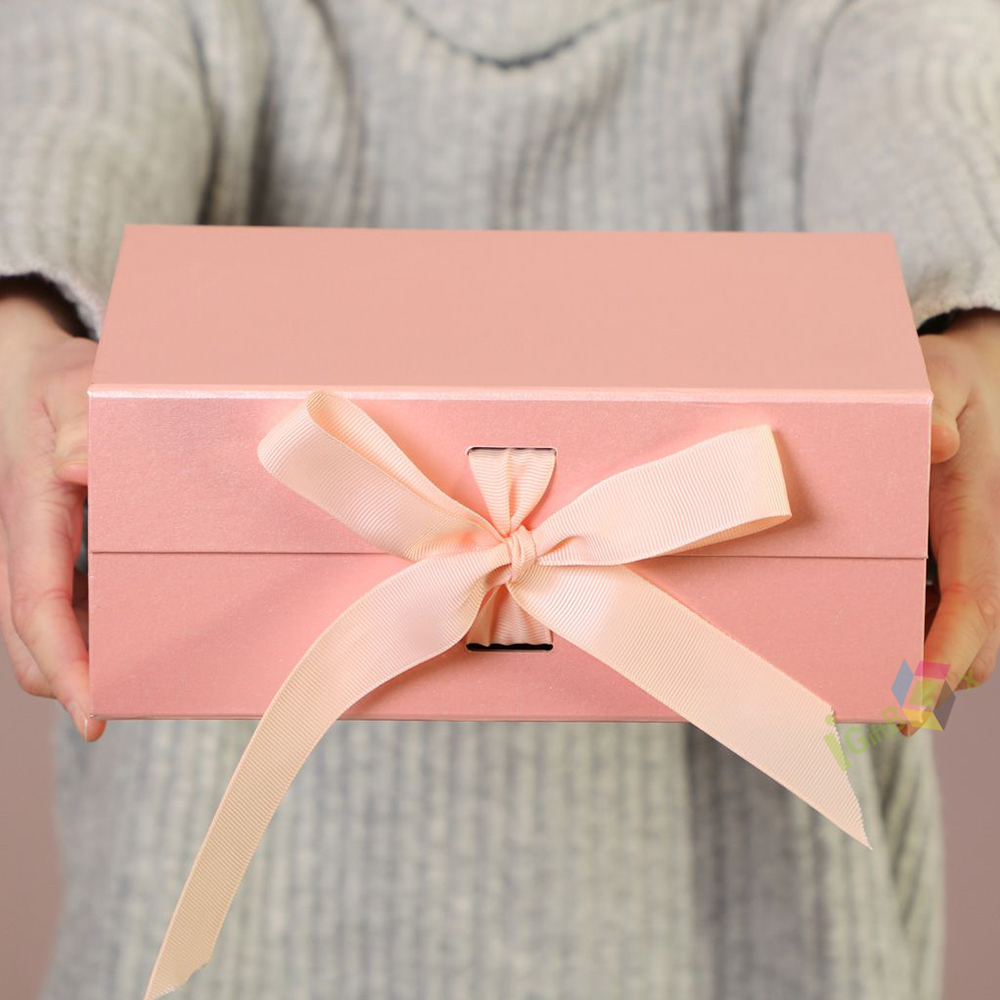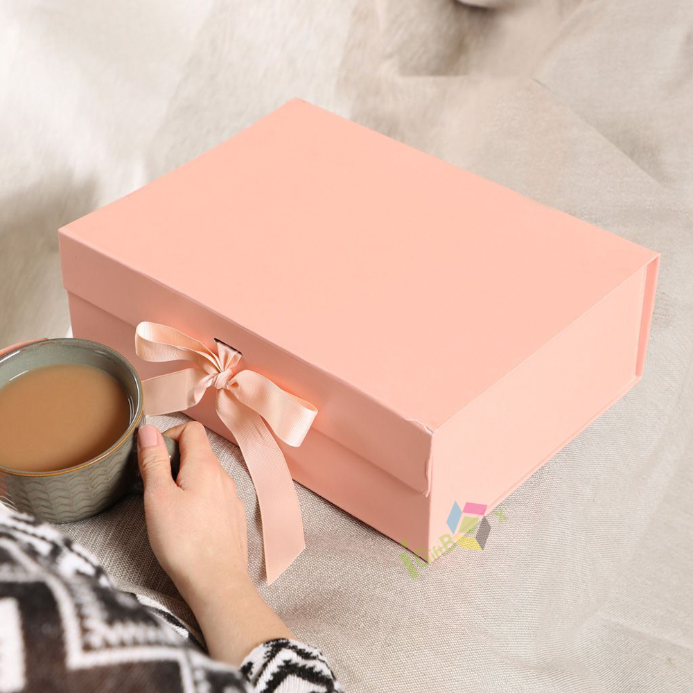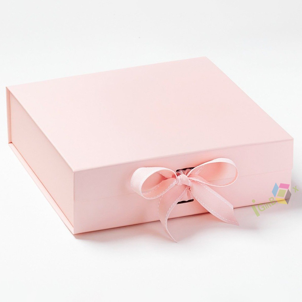 Soft blush pink rigid magnetic gift box featuring a matching satin ribbon bow closure for a romantic, elegant touch. Crafted from premium thick paperboard with a smooth matte finish, the box offers sturdy protection for your items while delivering a luxurious unboxing experience. The hidden magnetic closure ensures secure yet easy access, making it ideal for weddings, birthdays, anniversaries, cosmetics, jewelry, and special occasion gifting. Its minimalist pastel design complements any brand aesthetic, perfect for retail display and personal keepsake packaging.