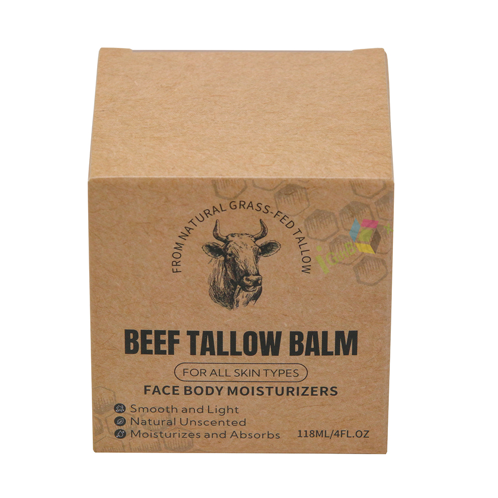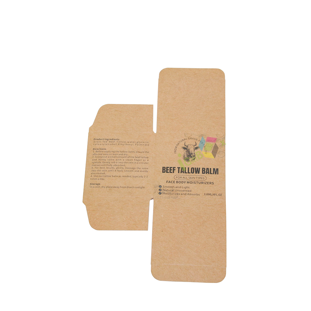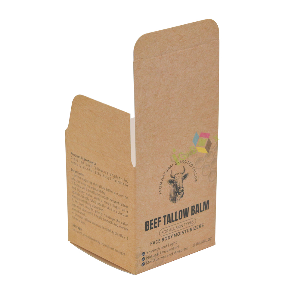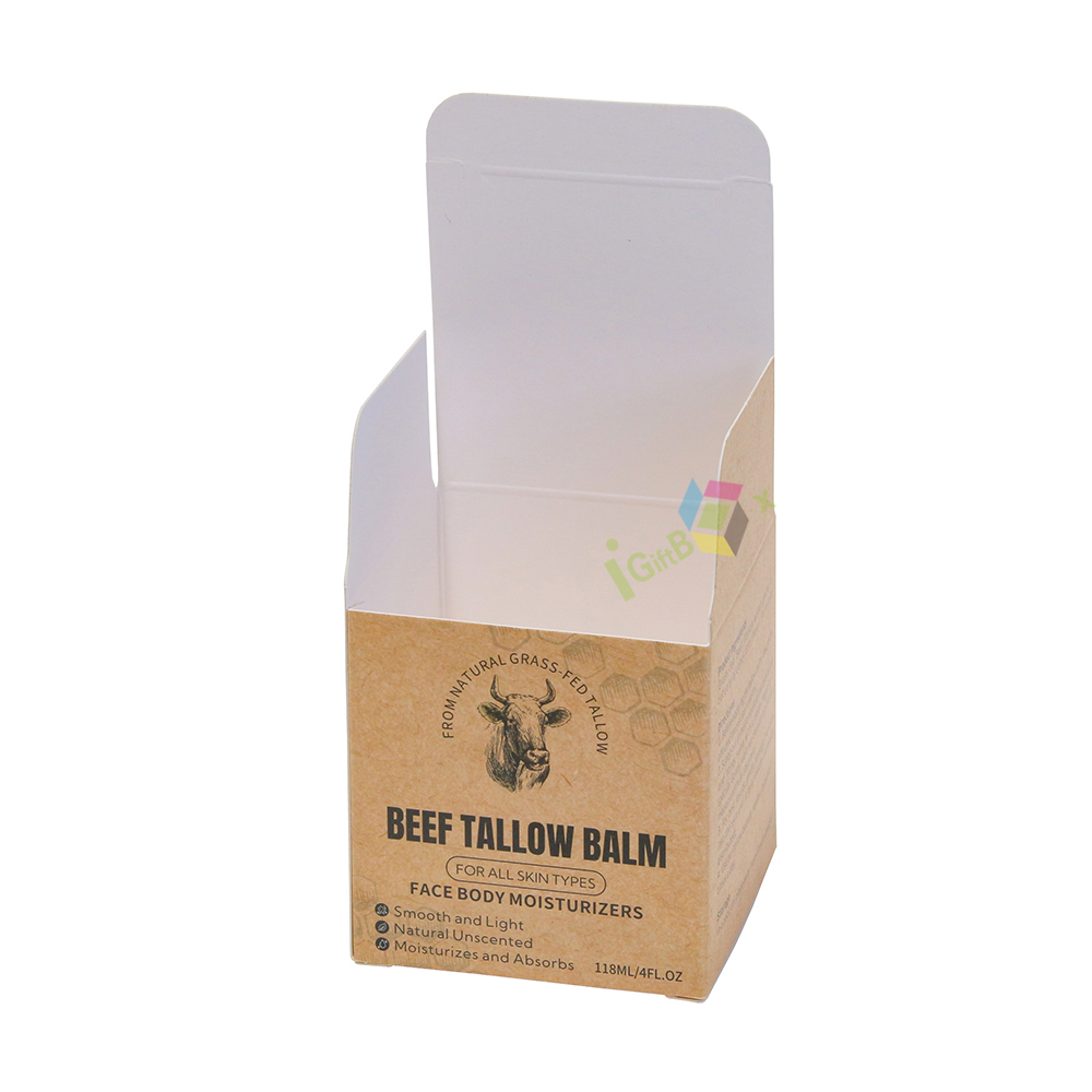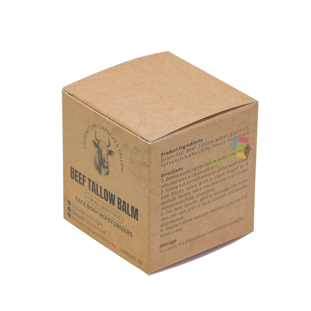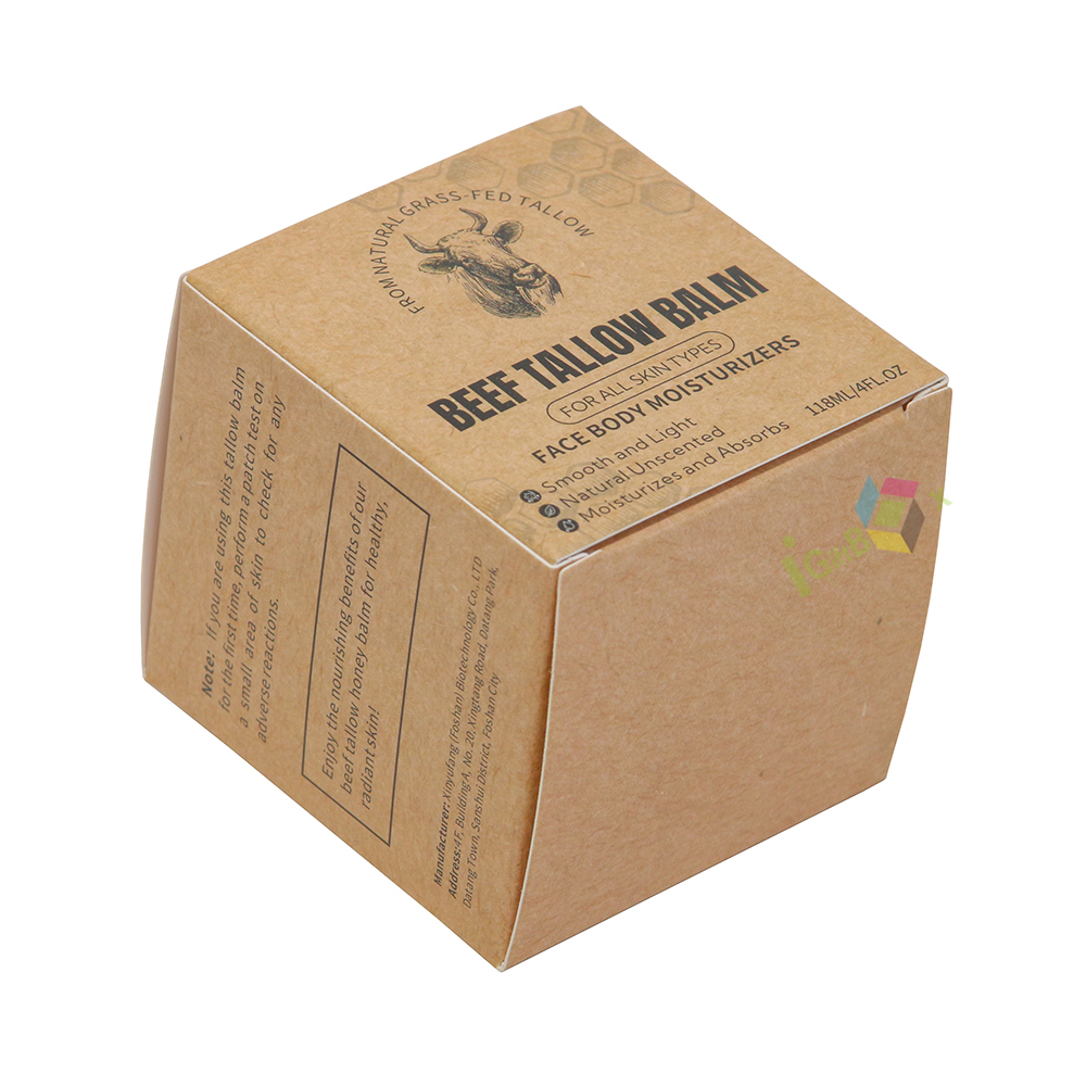 Compact cube kraft paper box for balm products, featuring natural rustic finish and detailed printed product information. Made from recyclable kraft paperboard, it protects solid balms securely, with easy assembly and an artisanal design perfect for natural skincare and wellness brands.