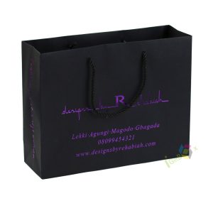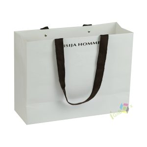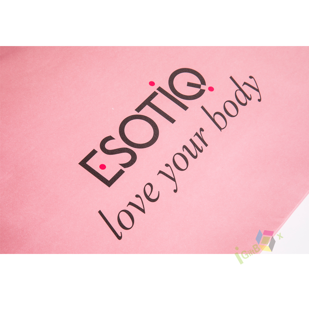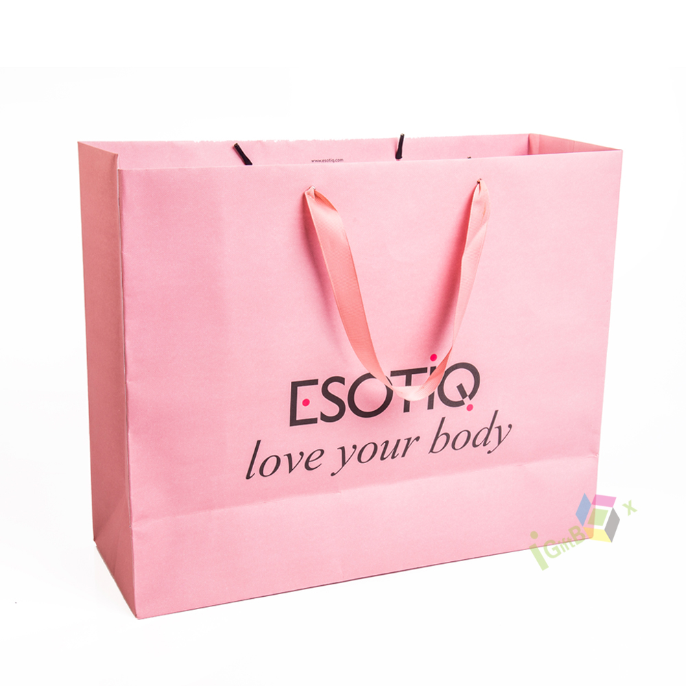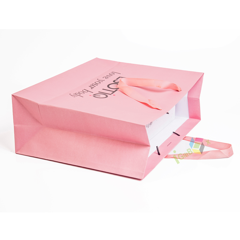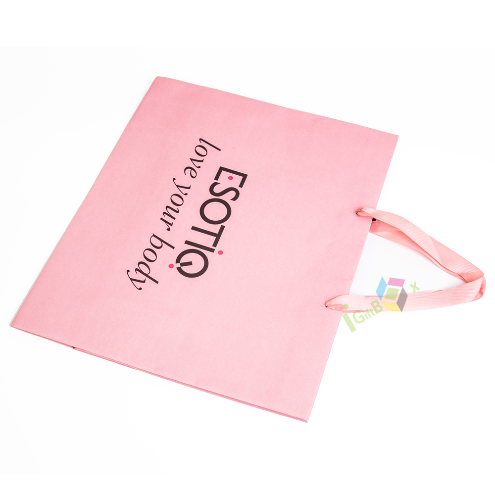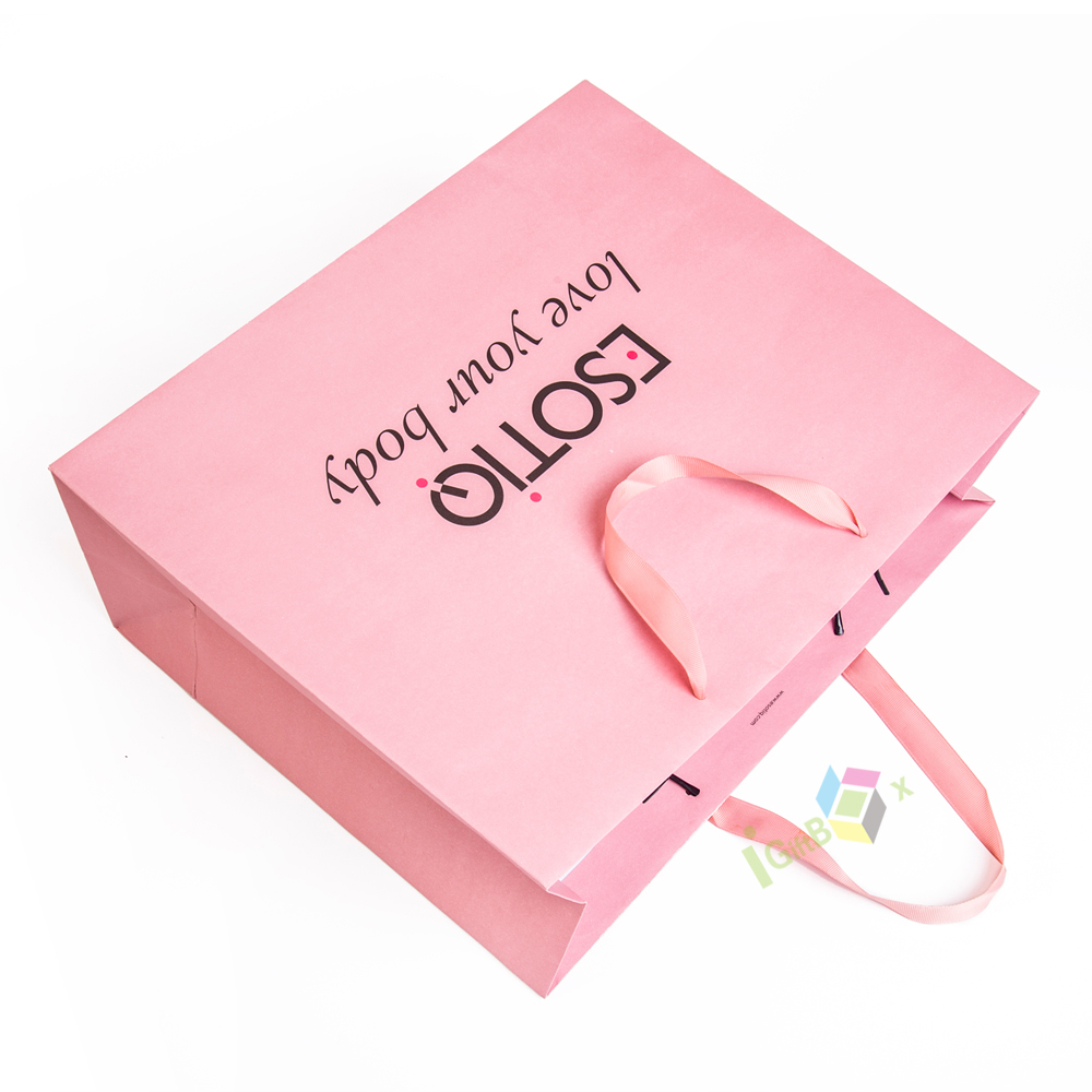 This soft pink paper shopping bag features elegant matching satin ribbon handles and crisp black custom print branding, including the logo. Crafted from thick, durable paper, it offers reliable strength for carrying apparel, lingerie, or beauty products, while the smooth matte pink finish creates a feminine, sophisticated aesthetic. The spacious design and sturdy construction make it ideal for retail boutiques, lingerie stores, or gifting, combining practical functionality with eye-catching brand presentation.