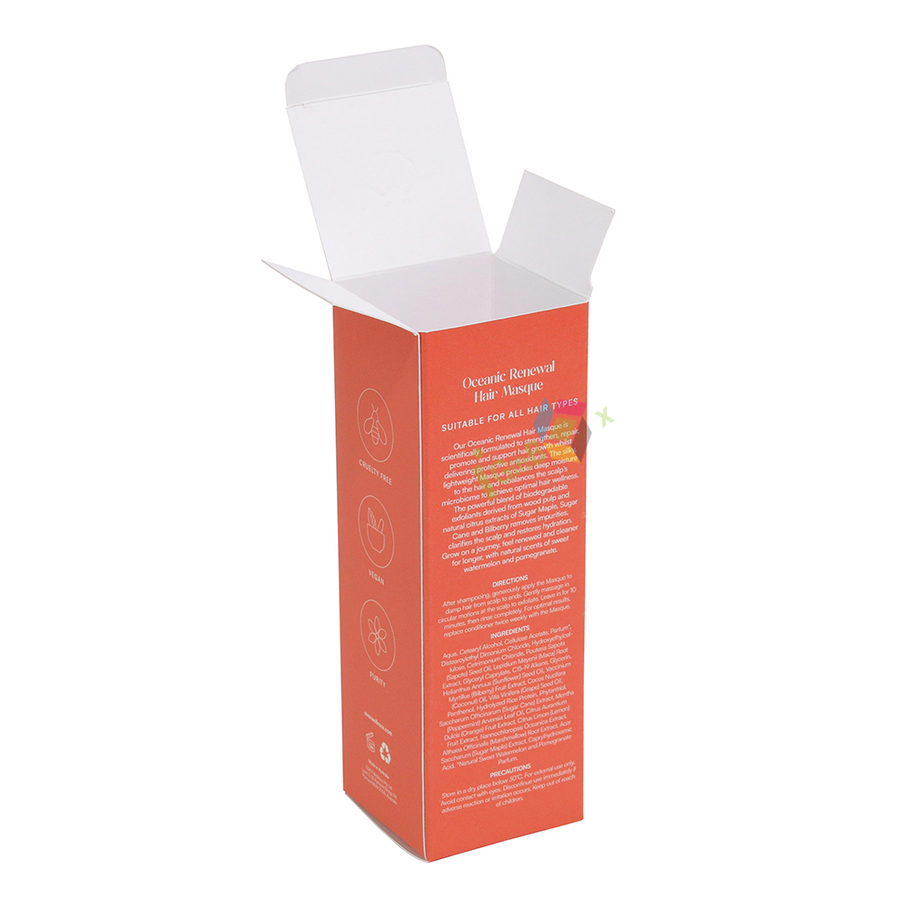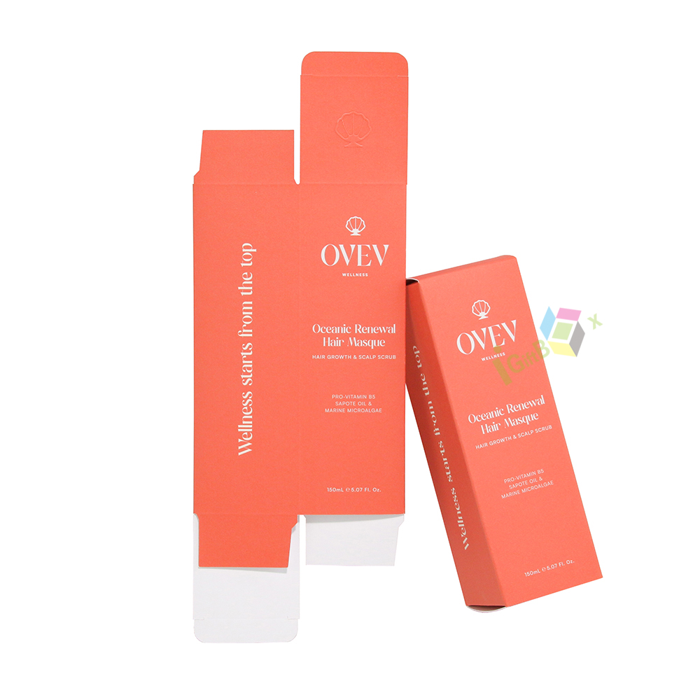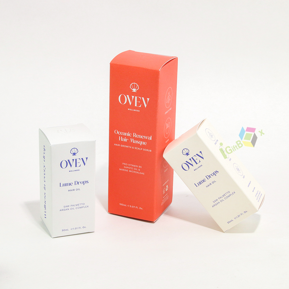Sleek cosmetic paper packaging set with minimalist design, available in vibrant orange, clean white, and soft cream finishes. Crafted from sturdy paperboard, each box features precise typography and a delicate shell logo, conveying a premium, natural wellness aesthetic. The vertical rectangular shape is ideal for hair oils, masques, and serums, offering reliable protection while enhancing shelf appeal. Consistent branding across sizes creates a cohesive product line, perfect for beauty and wellness brands aiming for a sophisticated, modern look.