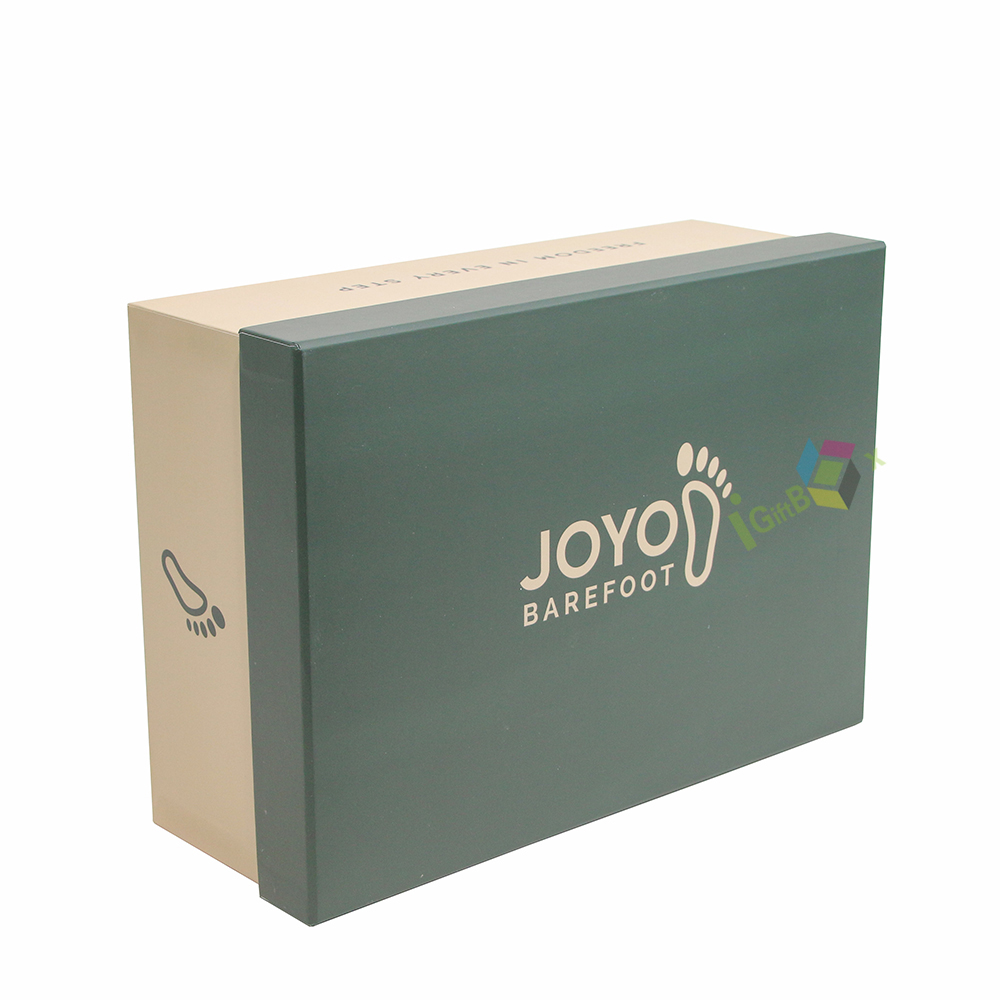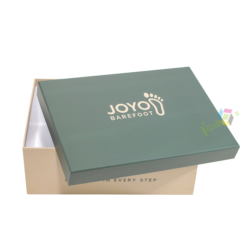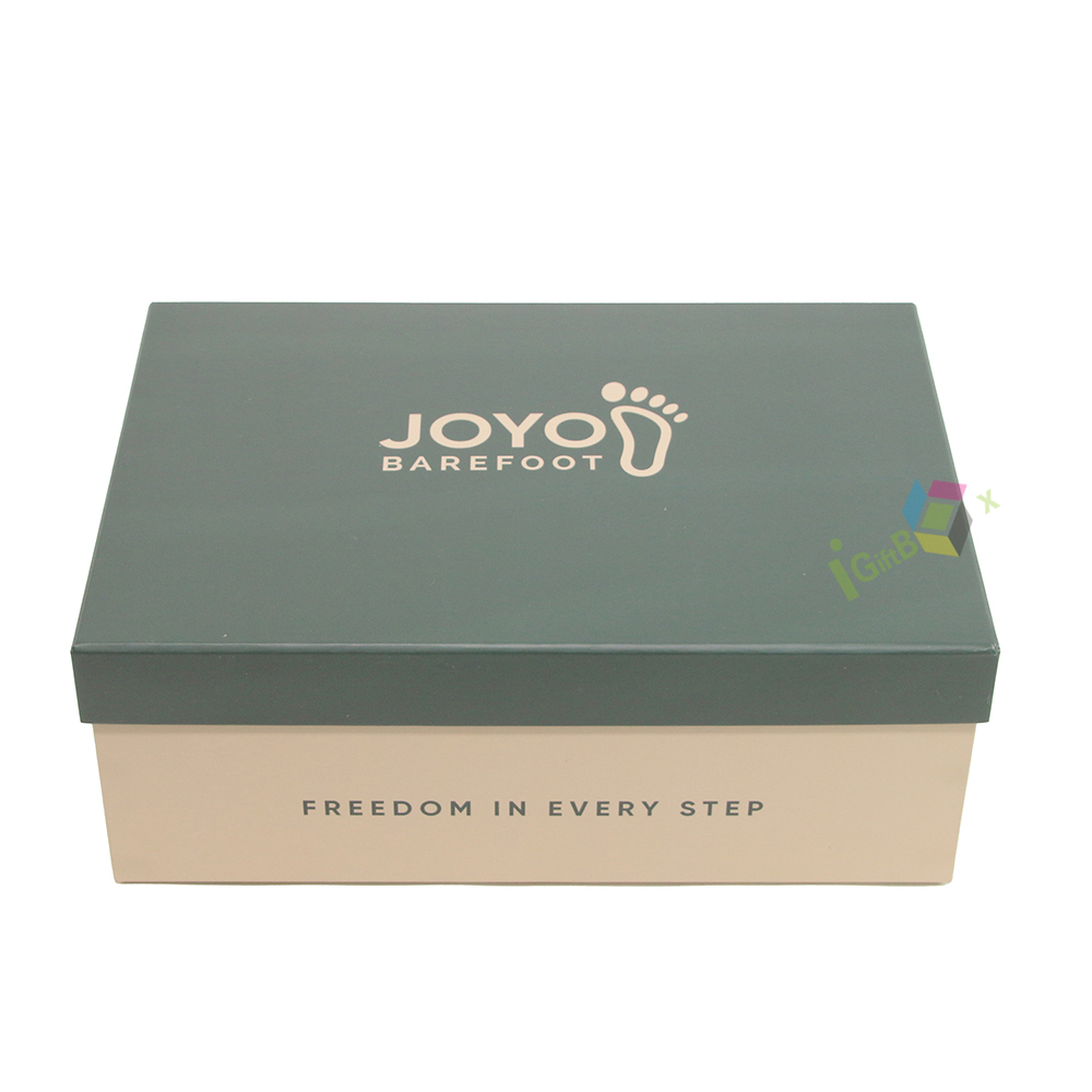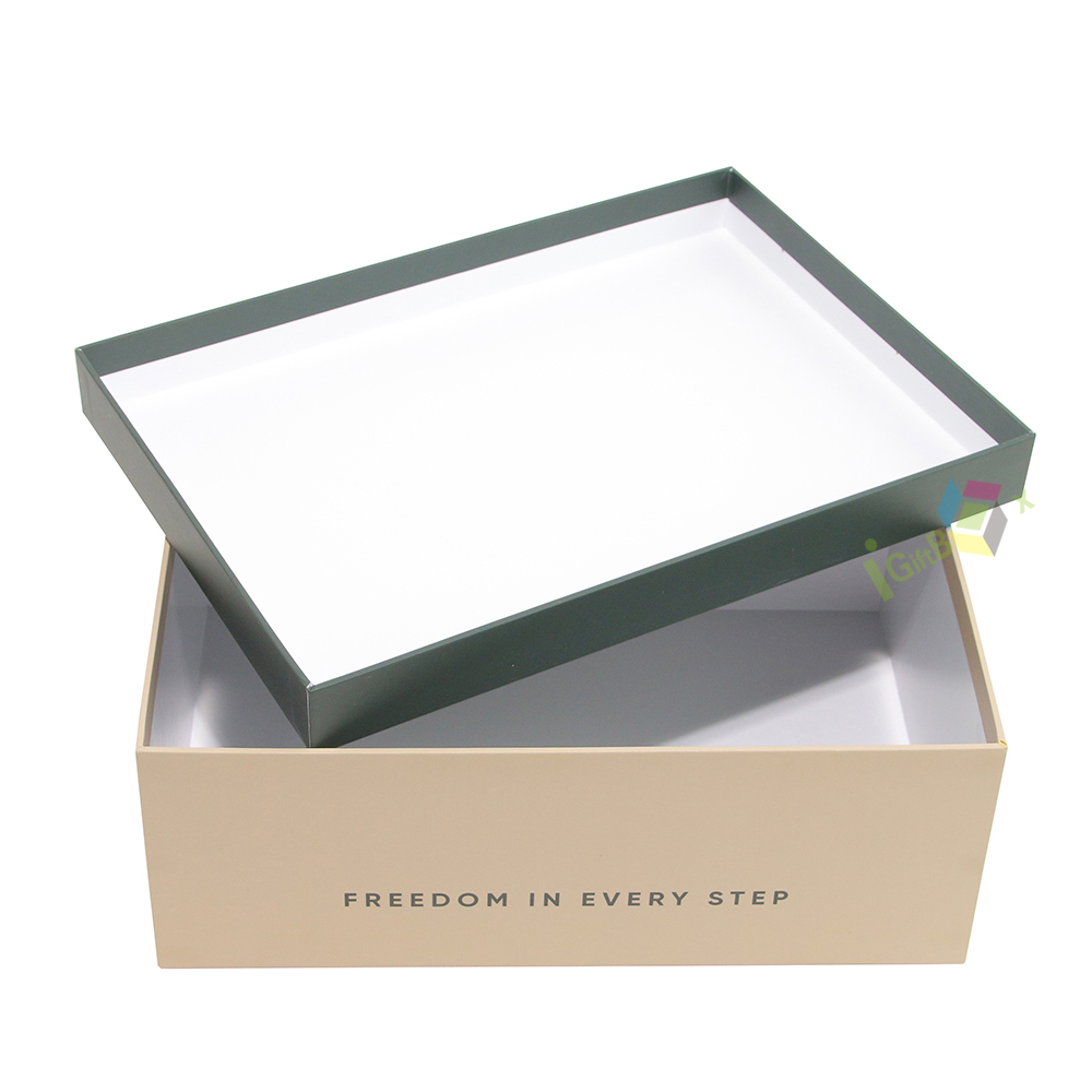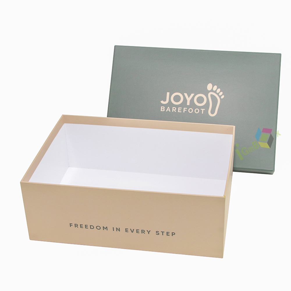 This elegant rigid shoe packaging box with slogan print features a stylish two-piece design, ideal for premium footwear branding and gift presentation.