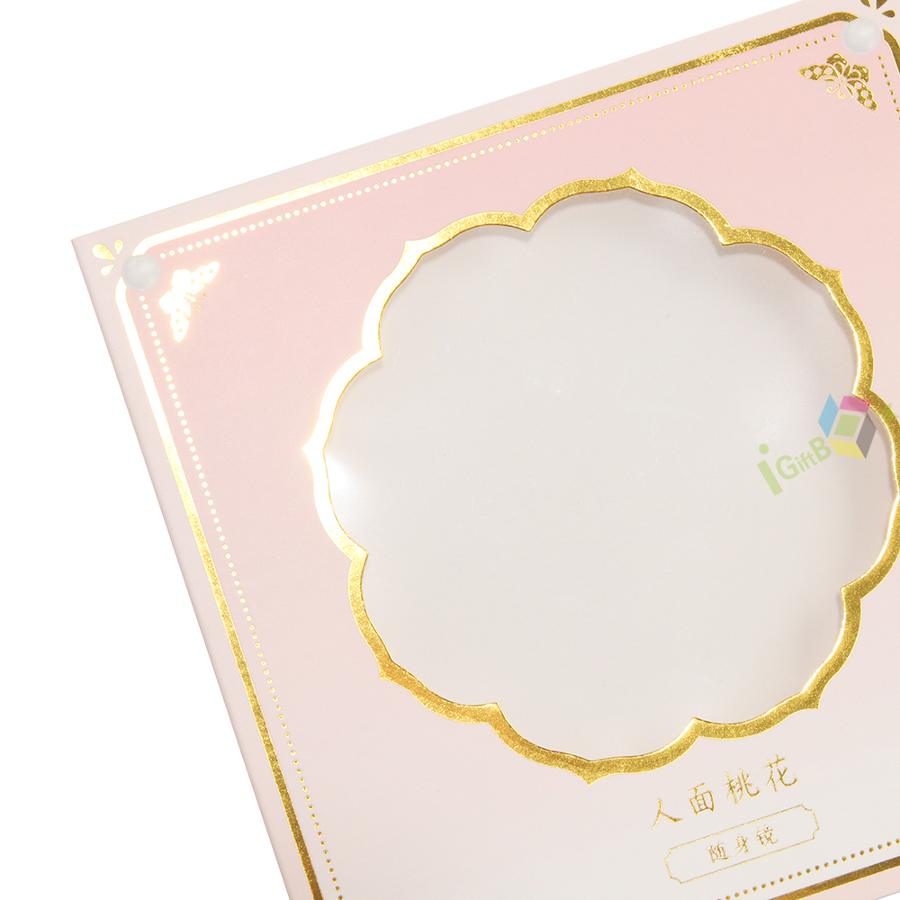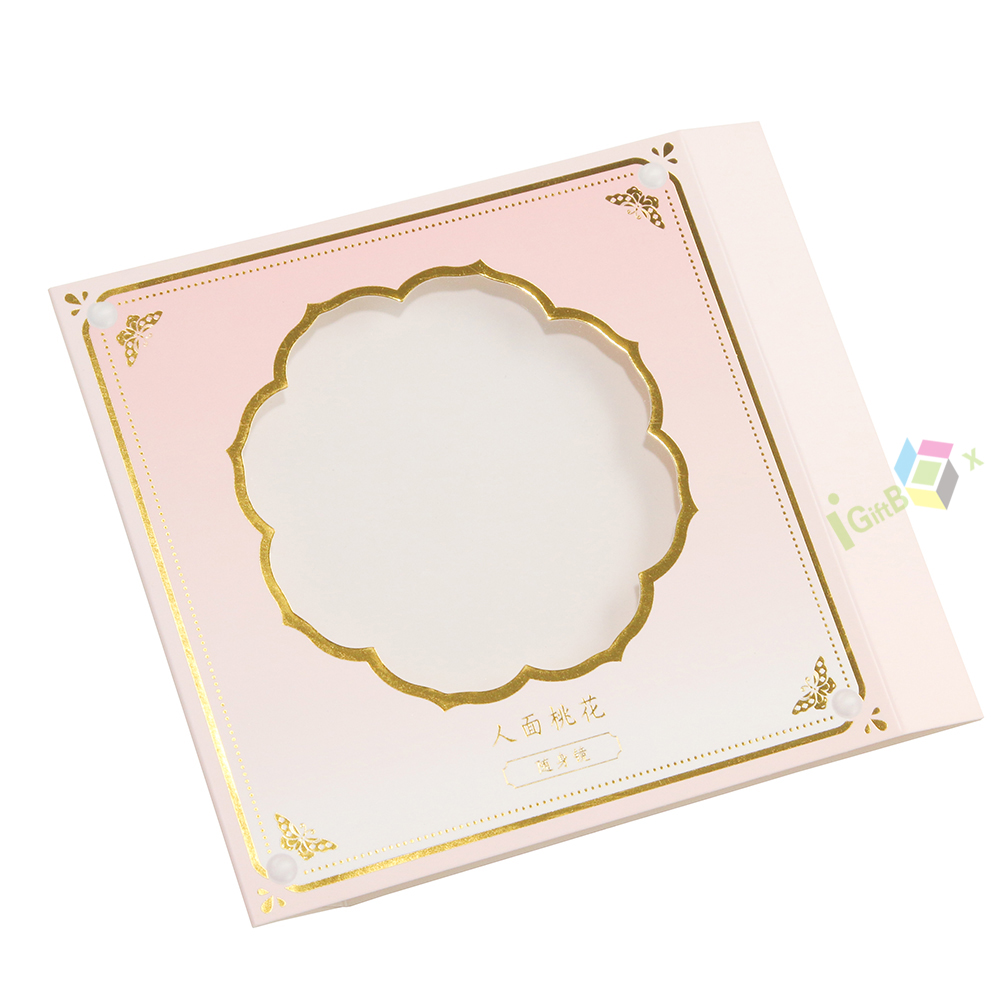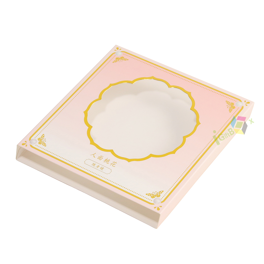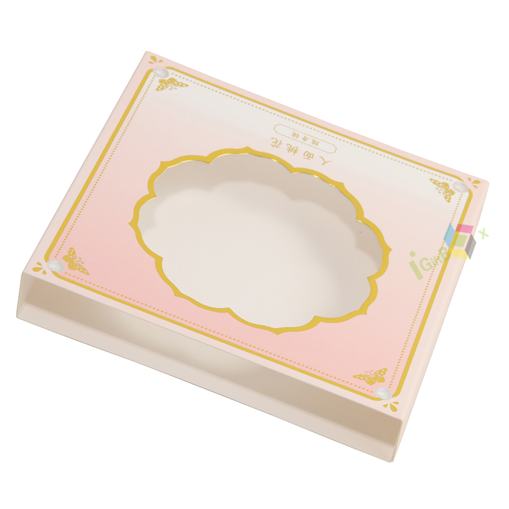 Elegant pink floral paper box sleeve featuring a delicate flower-shaped clear window for product display. Designed with a soft gradient pink base, ornate gold foil borders, and charming butterfly motifs, this sleeve adds a premium, luxurious touch. The structured slip-on design ensures a secure fit while elevating shelf appeal, making it ideal for high-end skincare, beauty, or gift set packaging.
