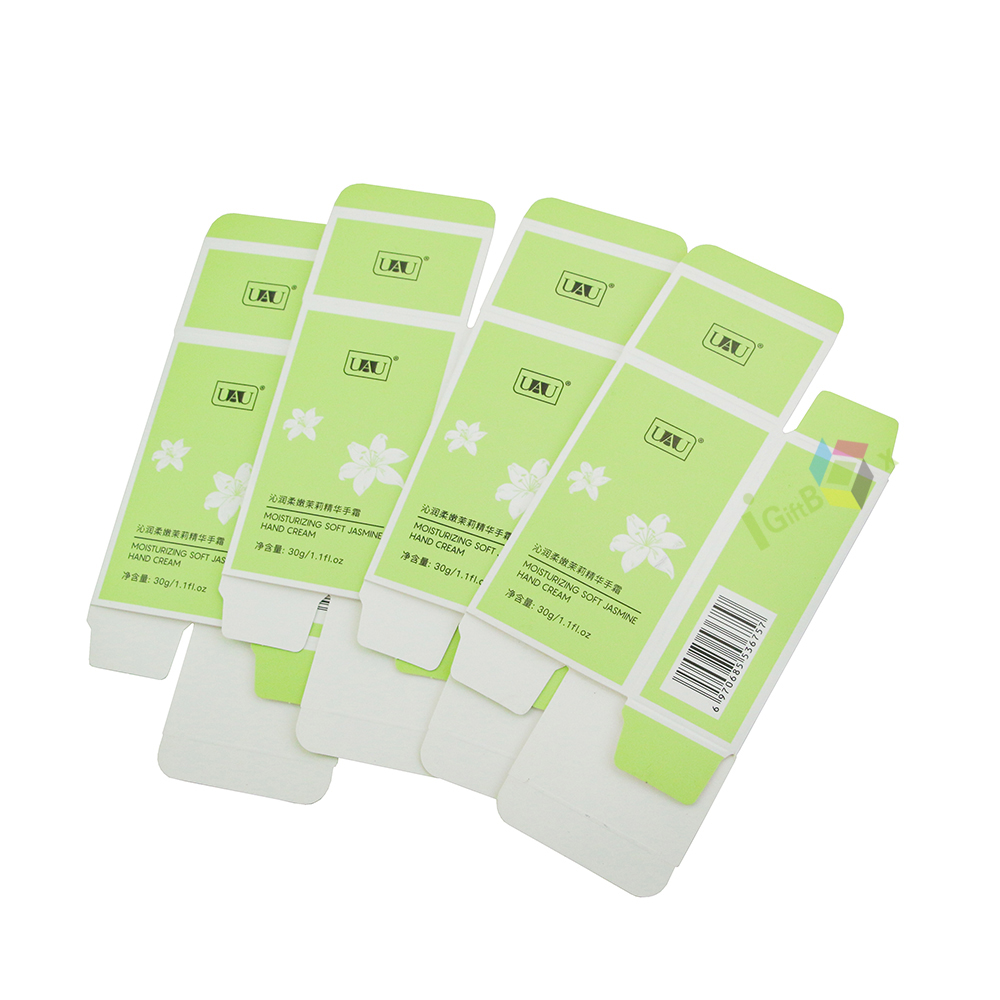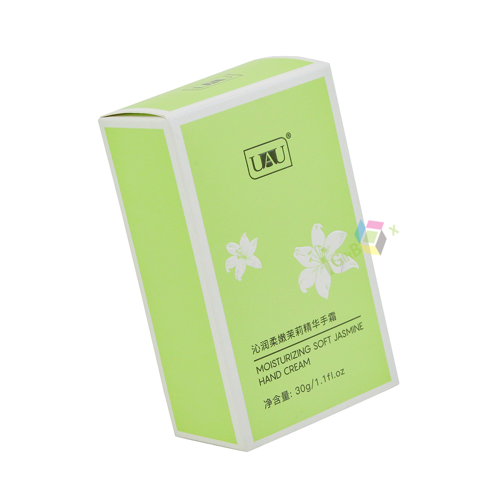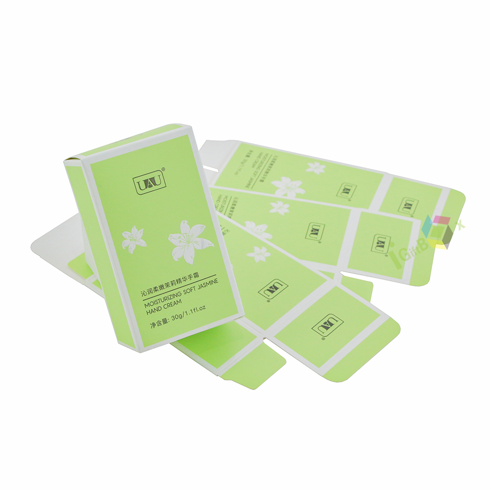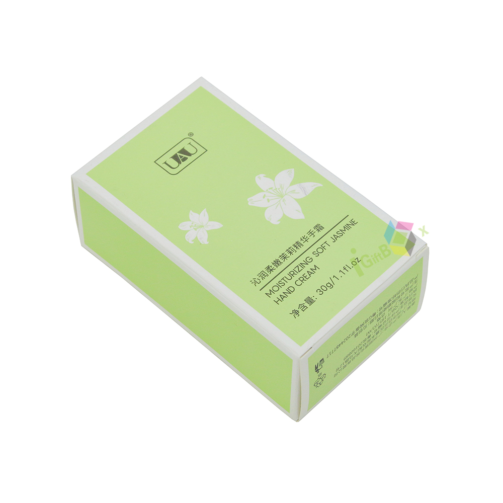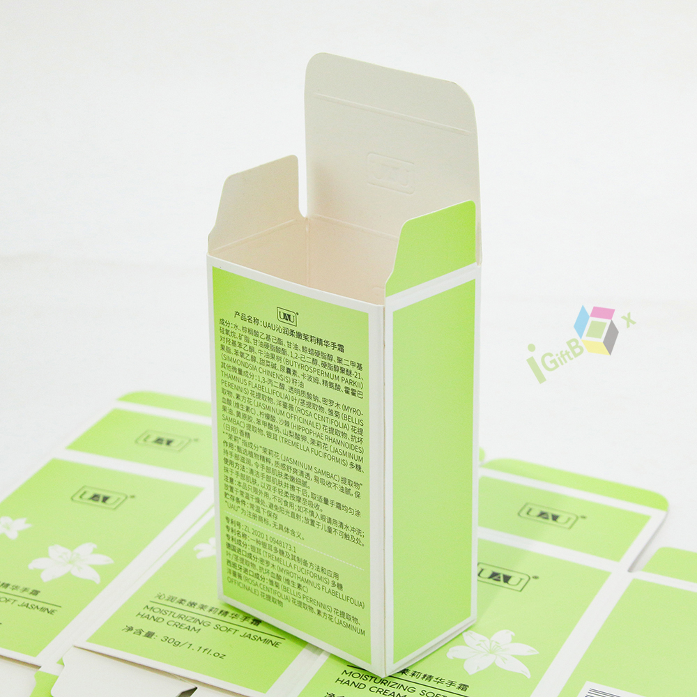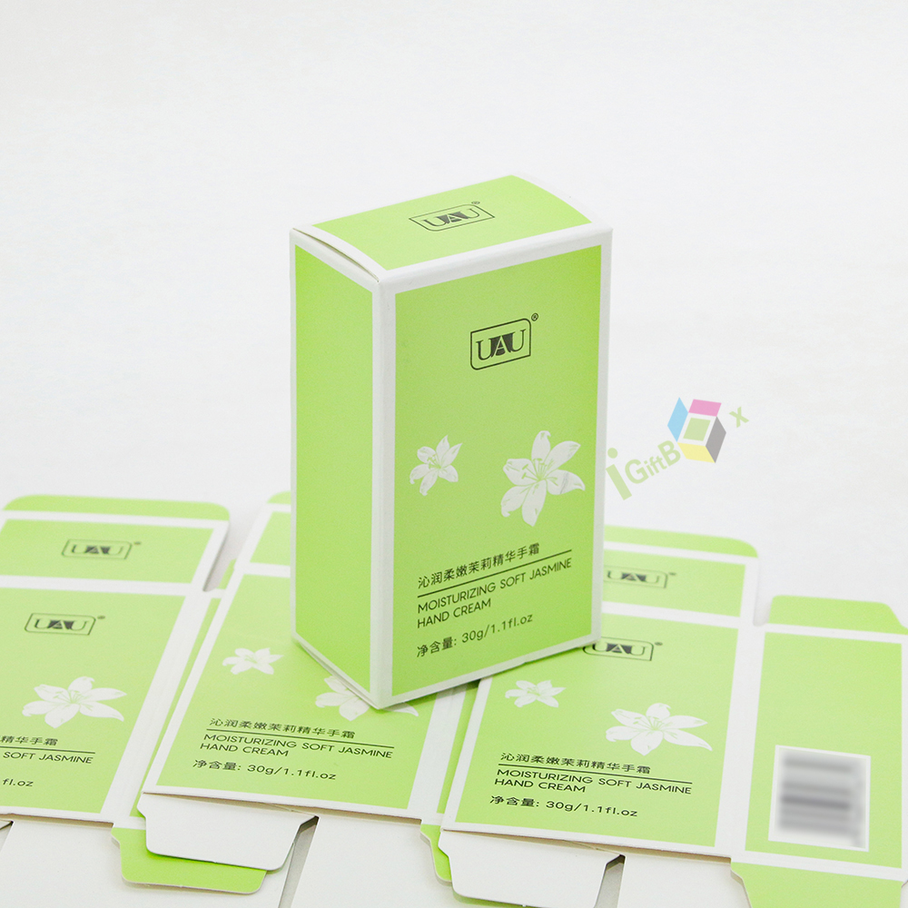 Fresh green paper packaging box features delicate white jasmine floral printing and a clean, minimalist design. Crafted from sturdy paperboard, it offers reliable protection for small items while maintaining a lightweight, easy-to-assemble structure. Consistent branding and precise printing ensure a cohesive, professional look, making it suitable for a wide range of products. Its compact size and flat-pack design make it efficient for storage and shipping, ideal for brands seeking a simple yet elegant packaging solution.