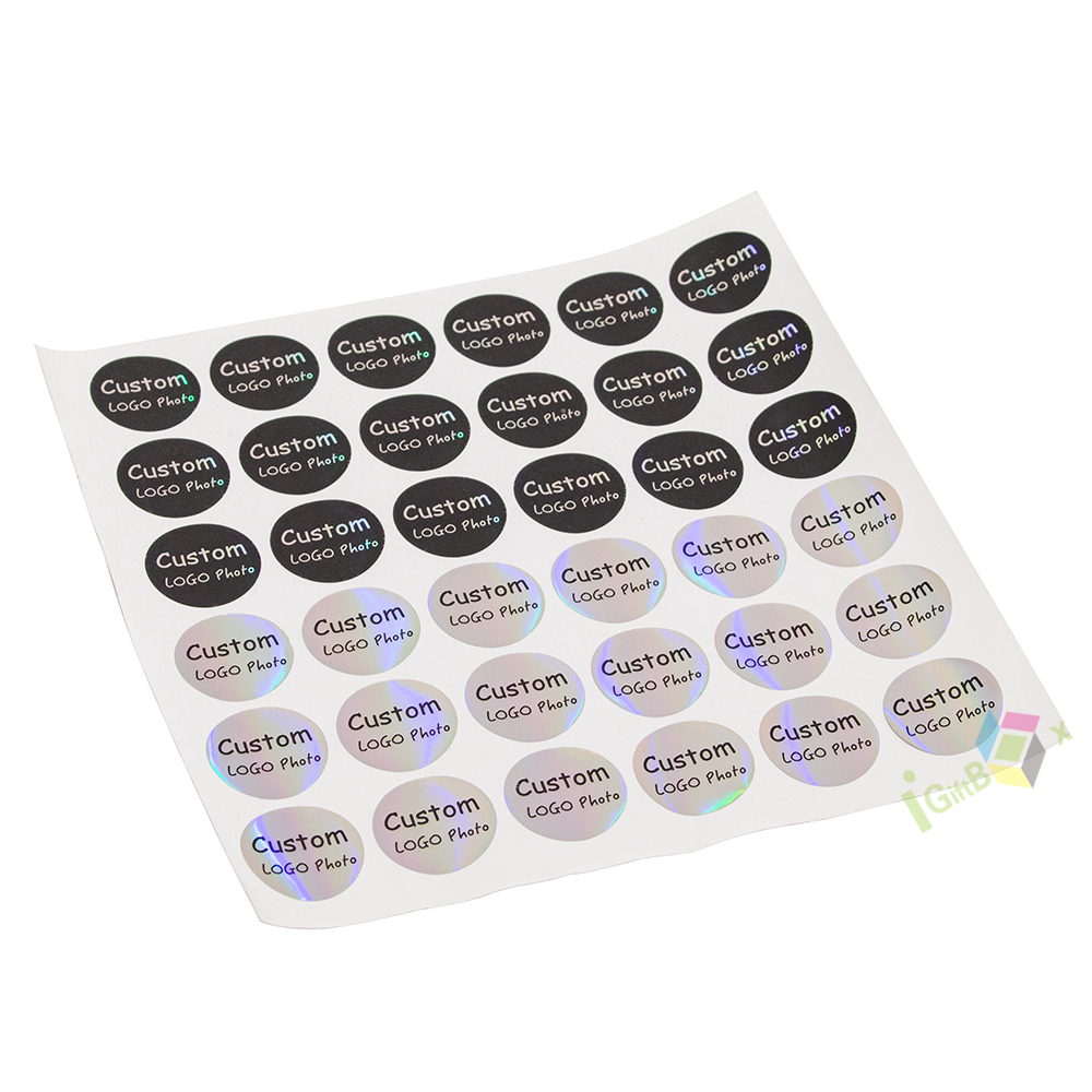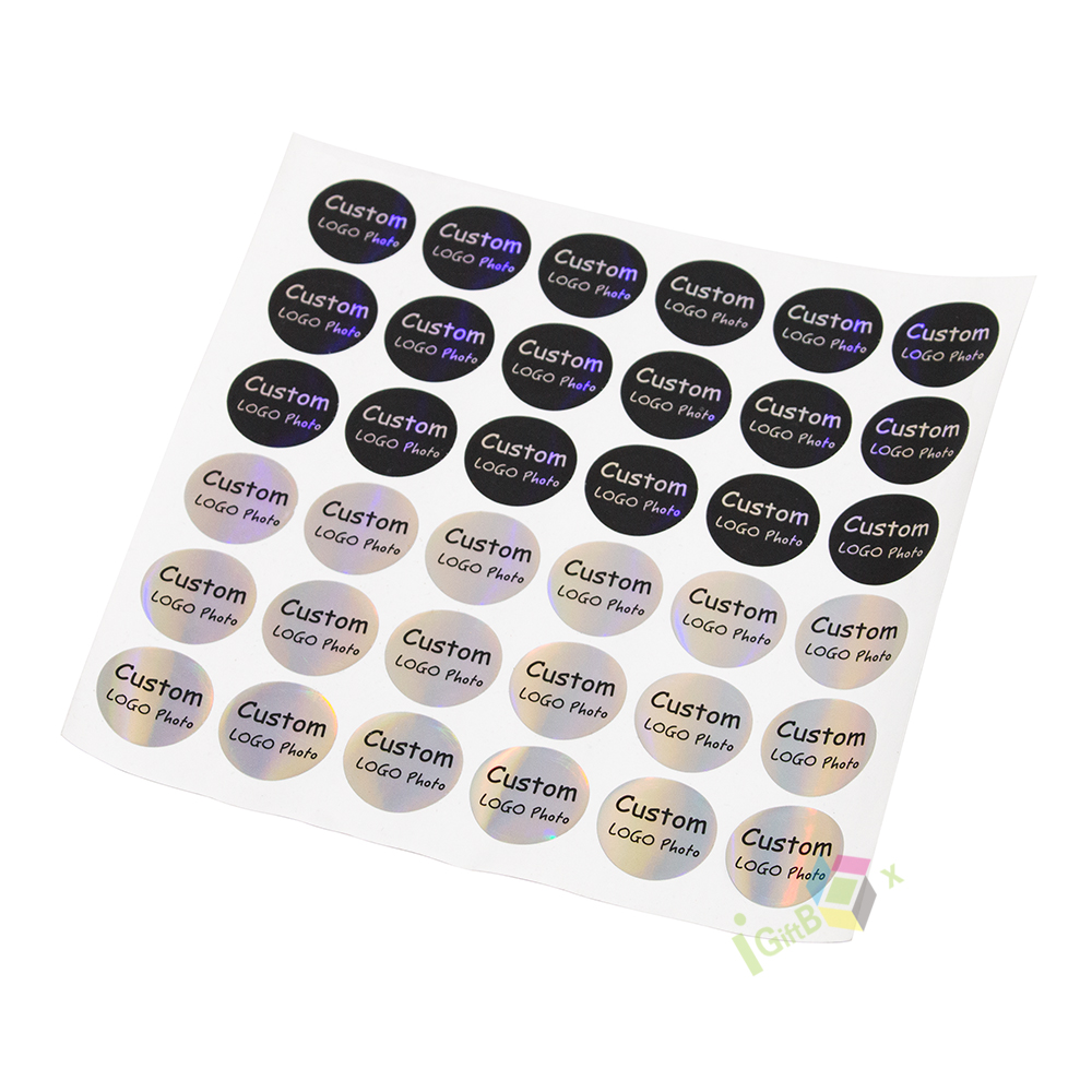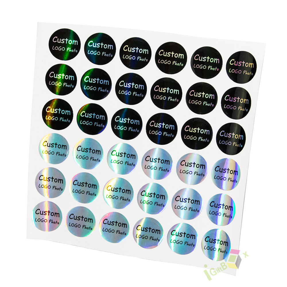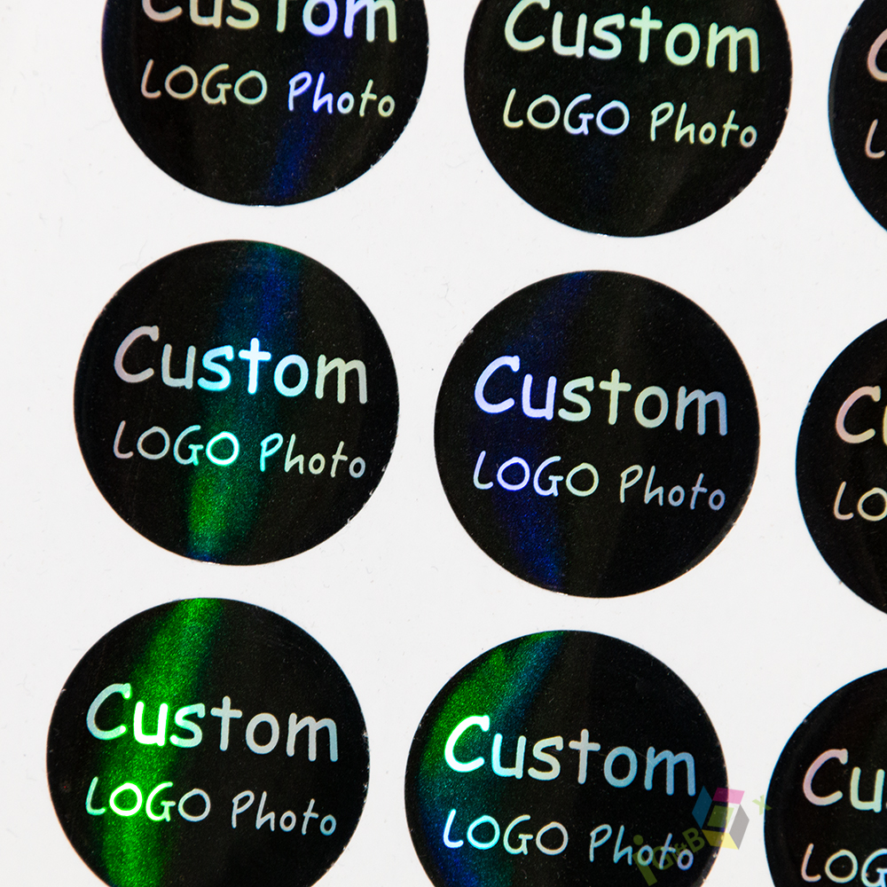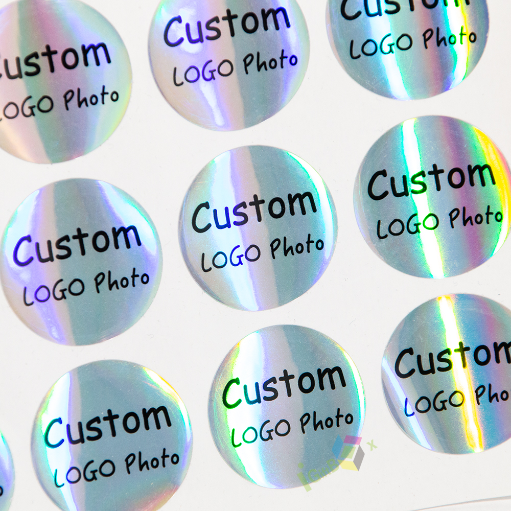 Shiny holographic round sticker labels with customizable logo and photo printing. Made from durable self-adhesive holographic film, these stickers feature a rainbow iridescent finish that reflects light dynamically. The clear black text ensures high visibility against the shimmering background, making them perfect for brand labeling, product packaging, decorative seals, and personalized gifts.