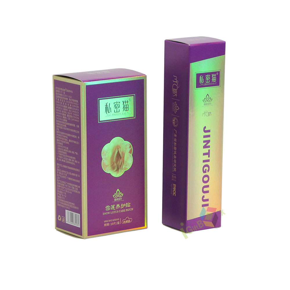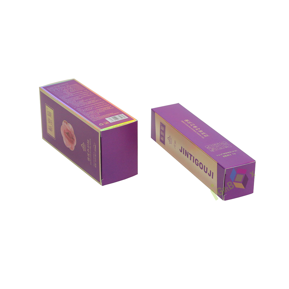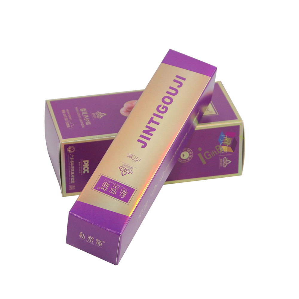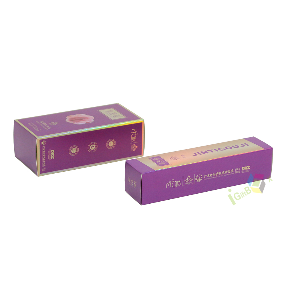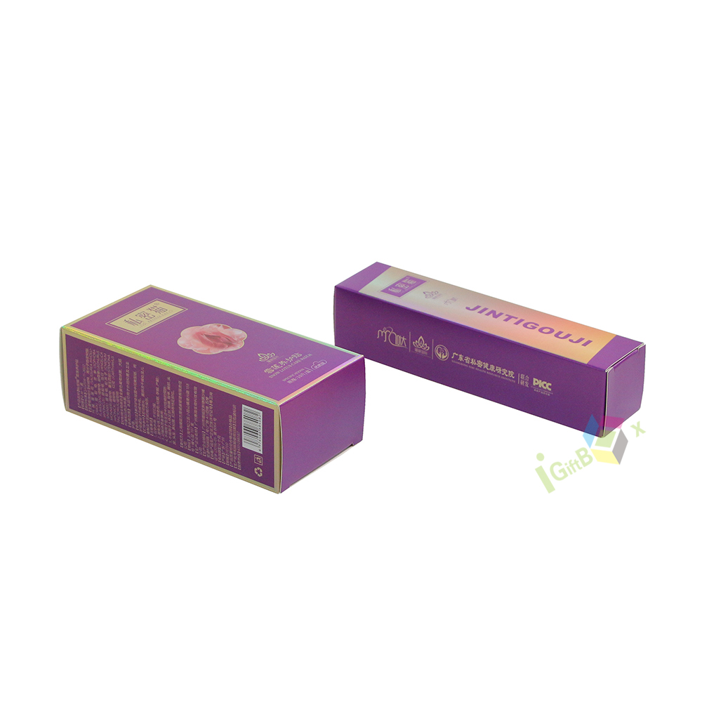Holographic laser finish purple cardboard cosmetic box with rigid structure, offering secure product protection and striking visual appeal for skincare items.