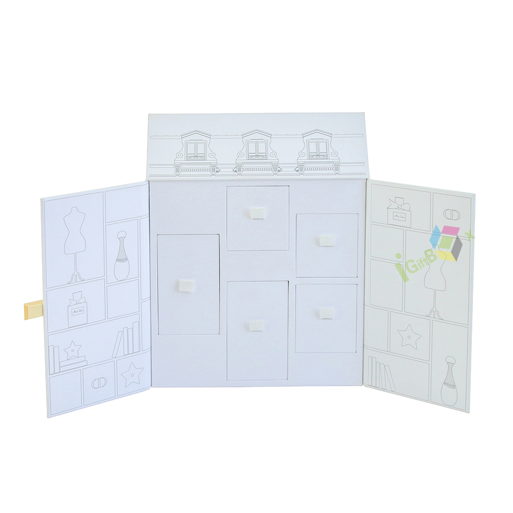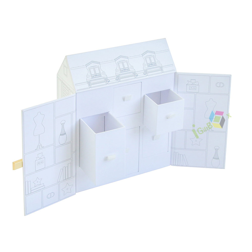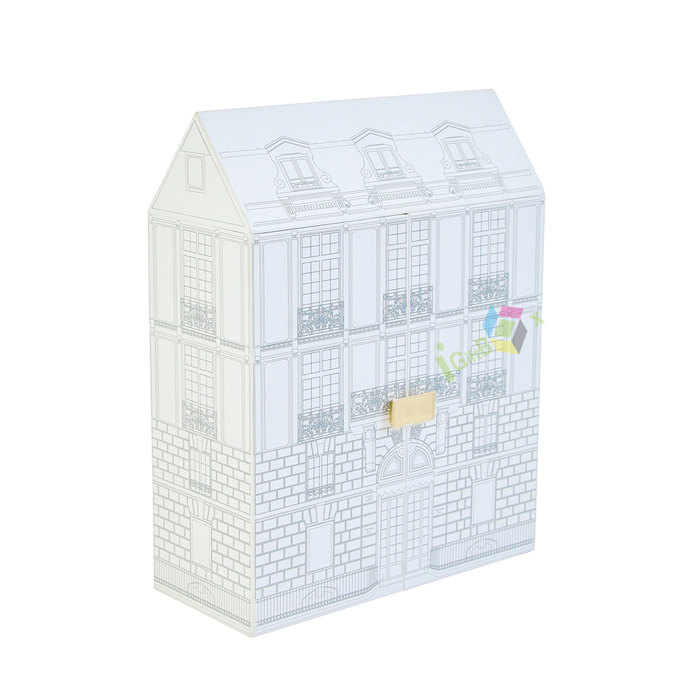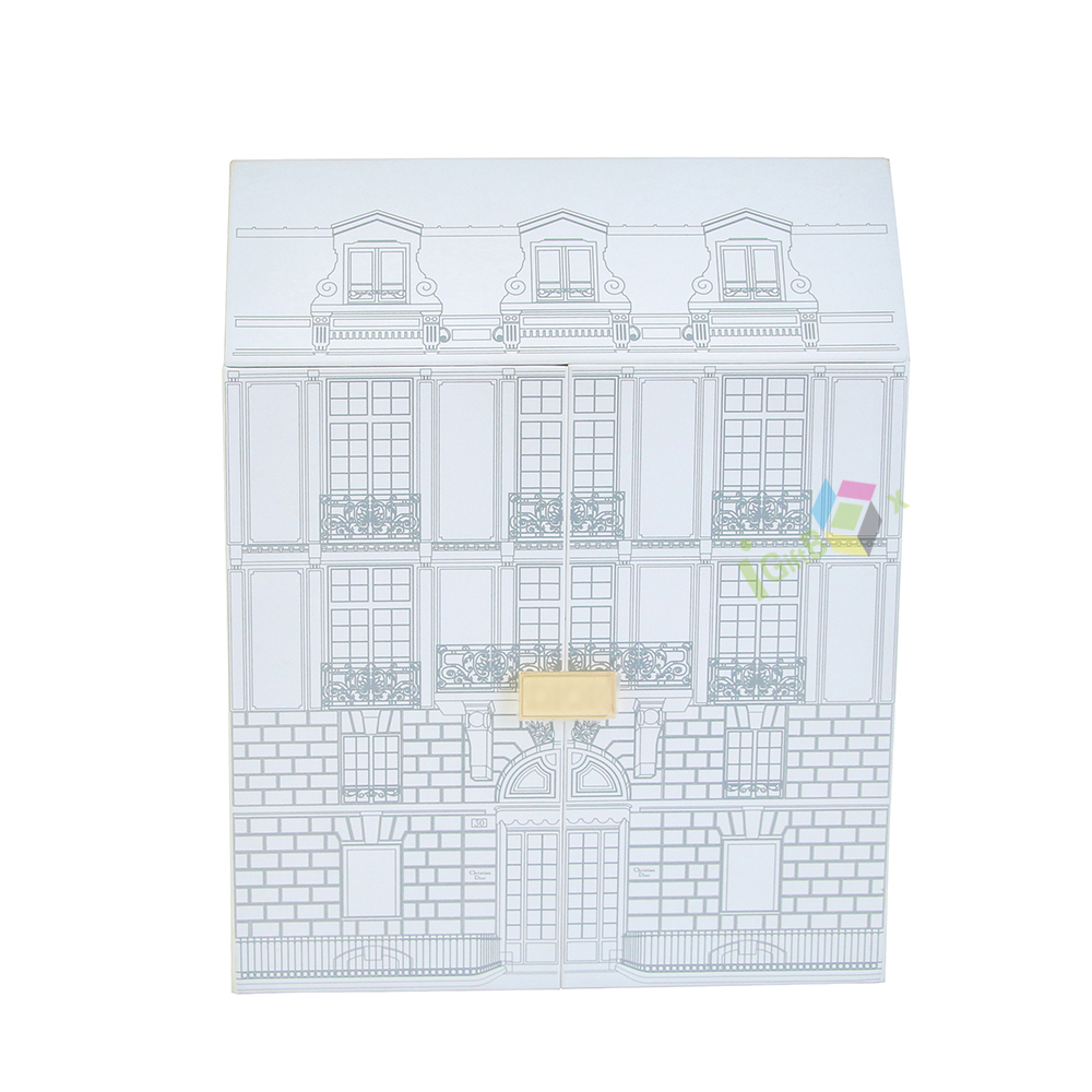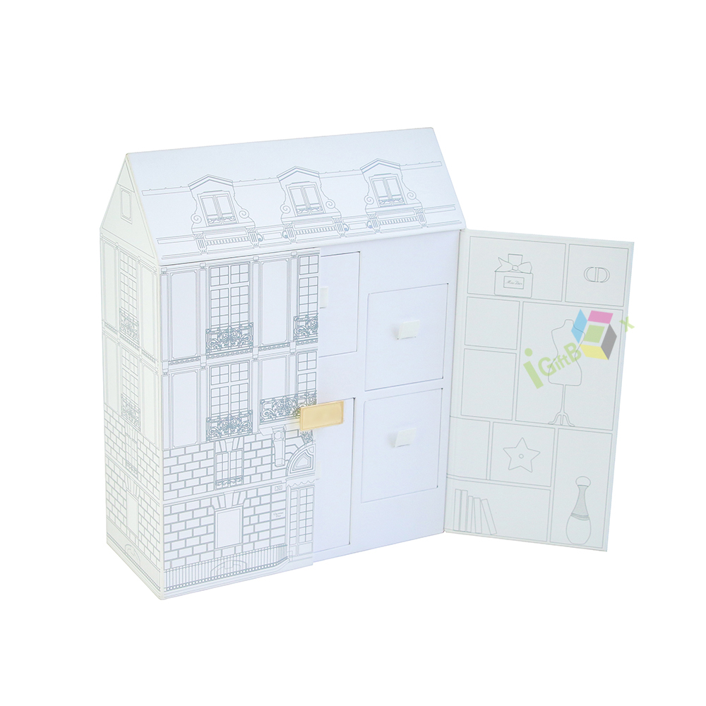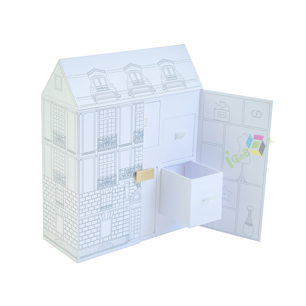 Charming house-shaped luxury gift box with intricate European-style architectural line art, designed for perfume and cosmetic sets. Crafted from sturdy paperboard, it features a side-opening door and two built-in drawers with white handles, offering organized storage for multiple beauty items. The delicate gold clasp adds a premium touch, while the clean white finish and detailed facade create a whimsical, high-end unboxing experience ideal for luxury brand gifting.