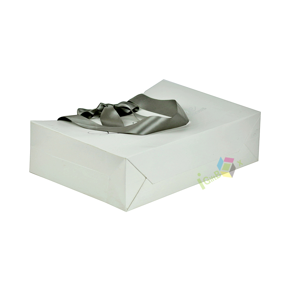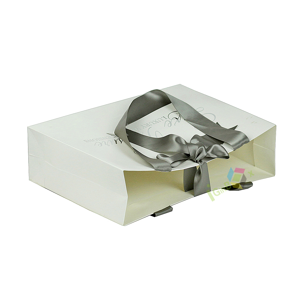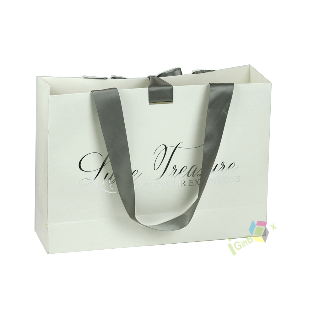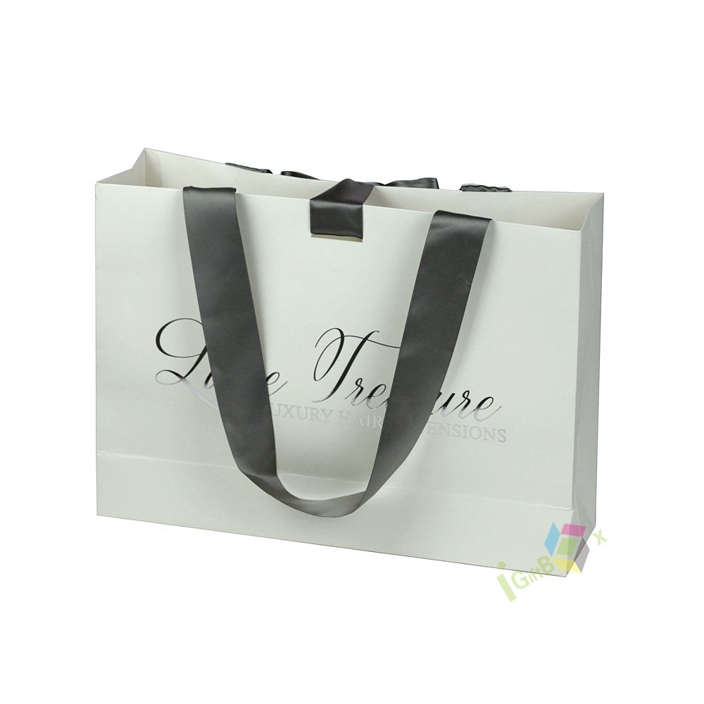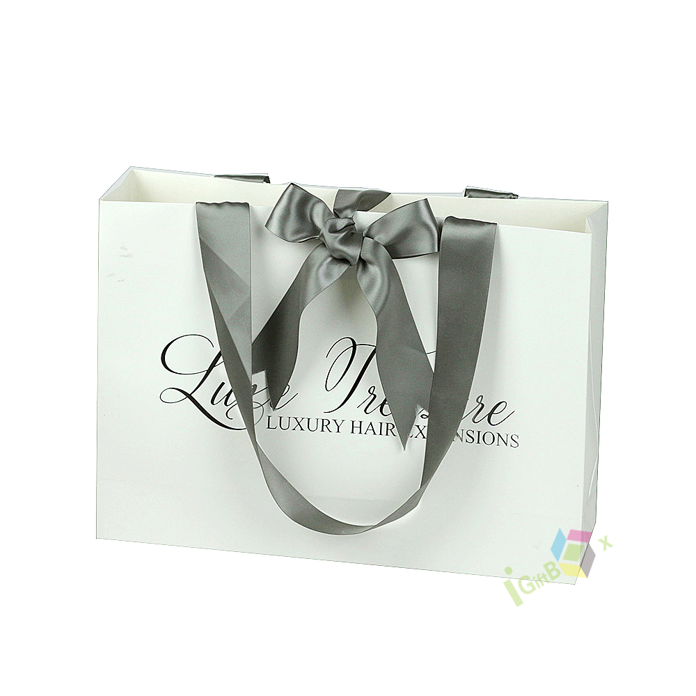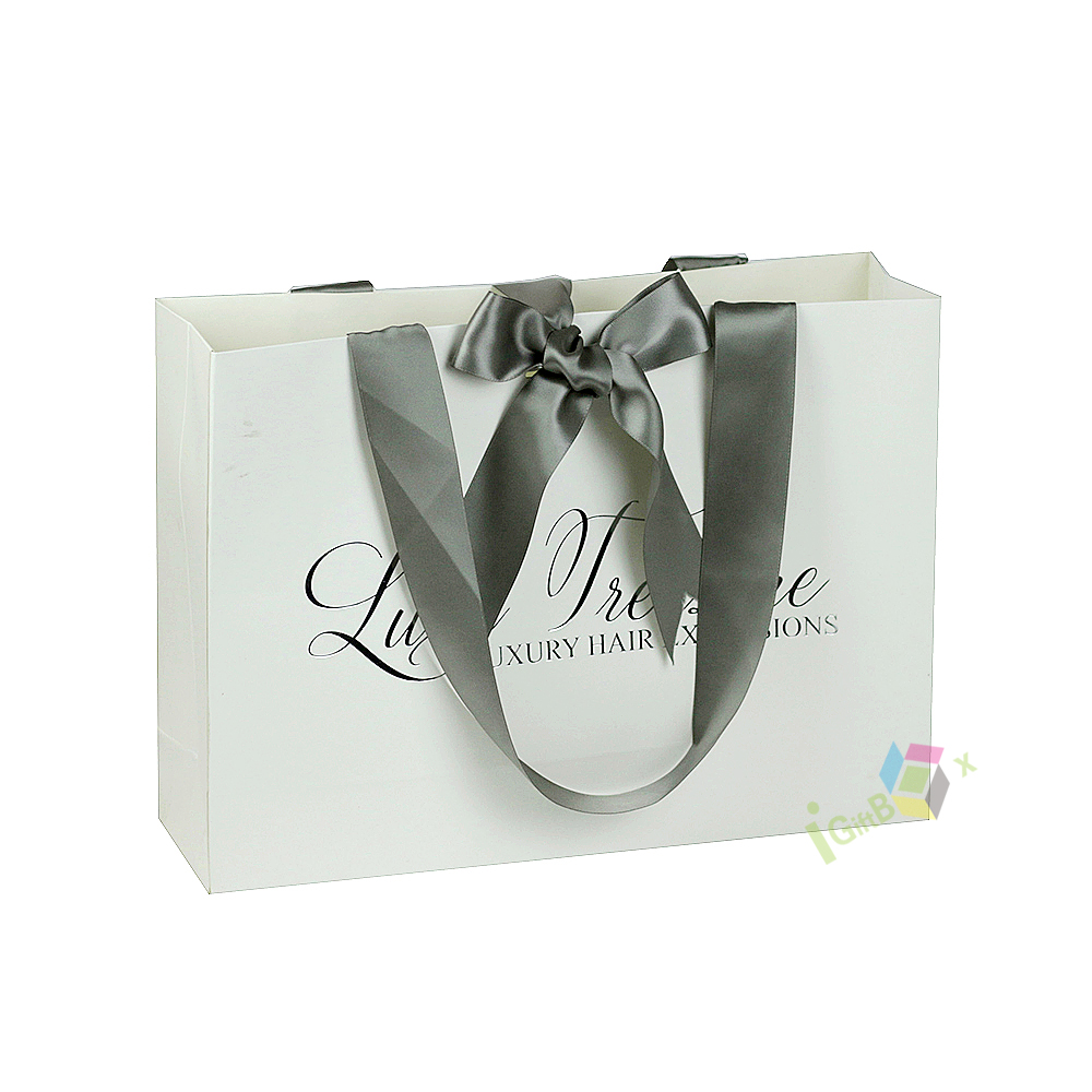 Elegant luxury gift bag crafted from premium white matte paper, featuring wide gray satin ribbon handles tied in a decorative bow for a sophisticated, high-end finish. The bag is printed with elegant cursive brand lettering, enhancing its premium aesthetic. Its sturdy, reinforced base and side gussets ensure durability for carrying gifts, beauty products, or luxury hair extensions, making it ideal for boutique retail, gifting, and special events.