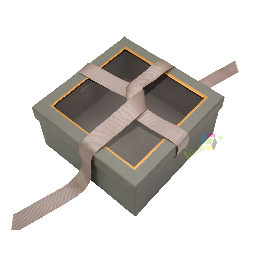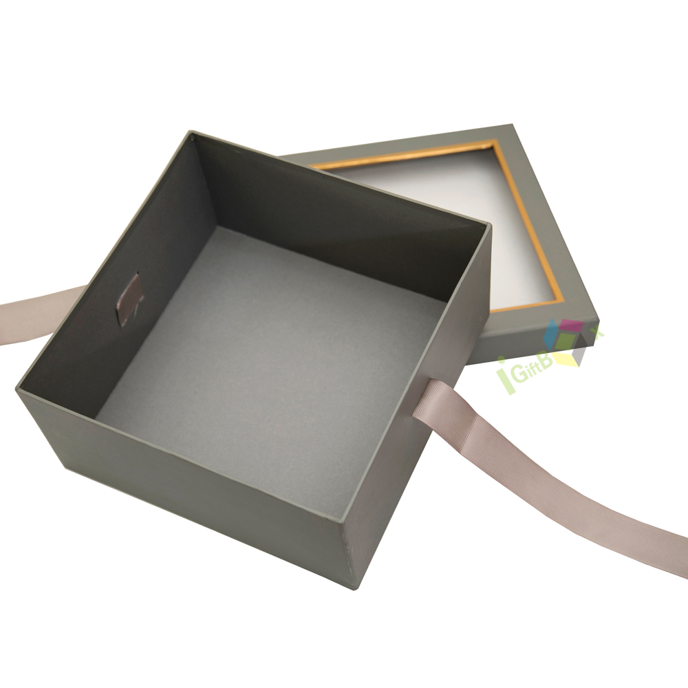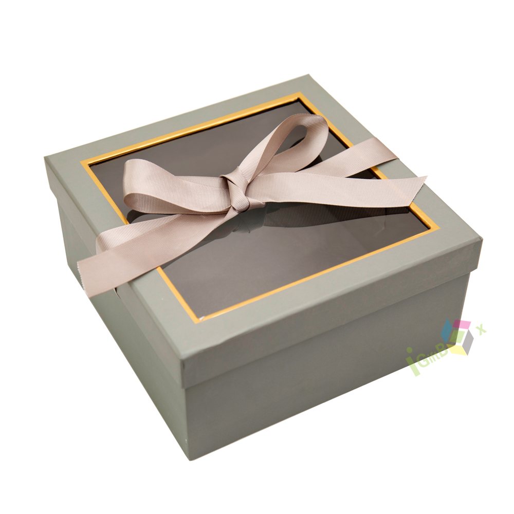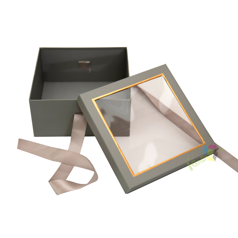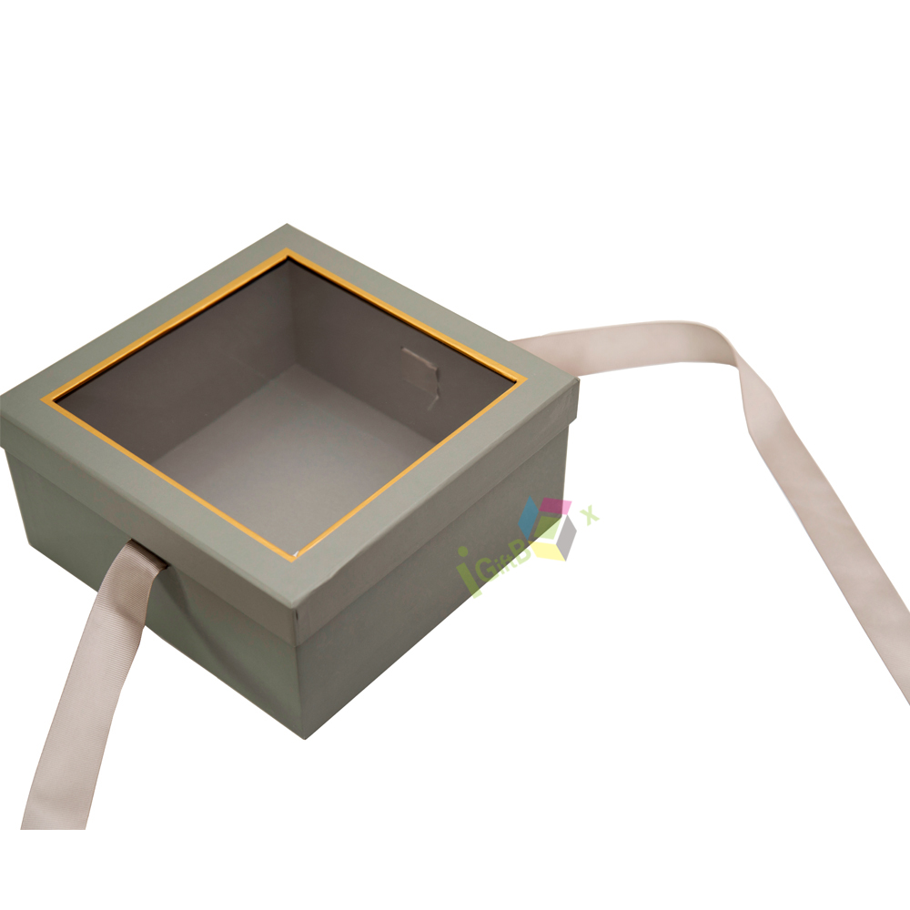 Elegant rigid gift box featuring a large clear window with a delicate gold foil border, allowing for product display while adding a premium touch. Crafted from sturdy gray paperboard, the box comes with a soft beige satin ribbon for secure closure and decorative detailing. The minimalist design combines neutral tones with luxurious accents, making it perfect for high-end gifts, cosmetics, jewelry, or boutique items. Its structured build ensures durability during shipping and storage, elevating the unboxing experience for any special occasion.