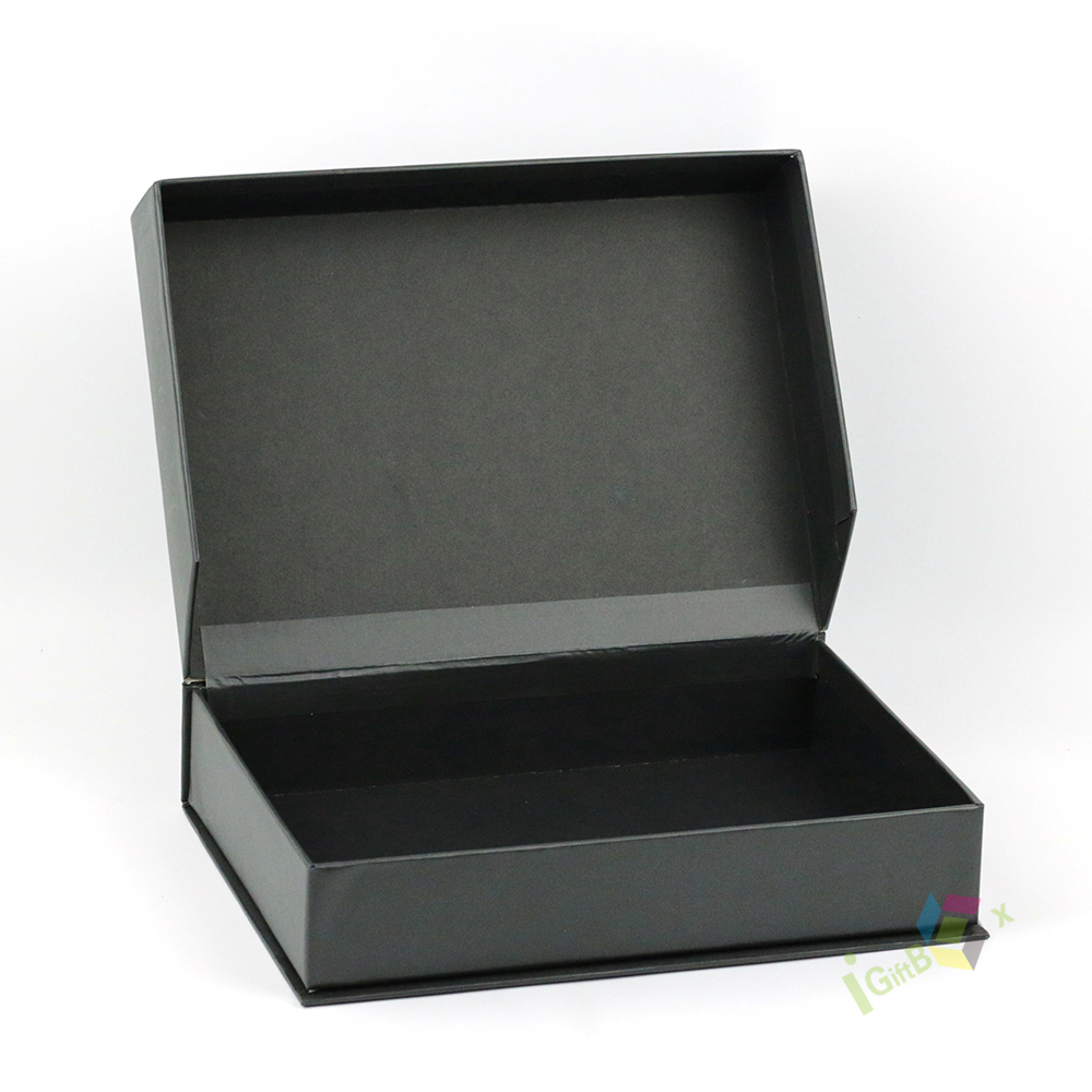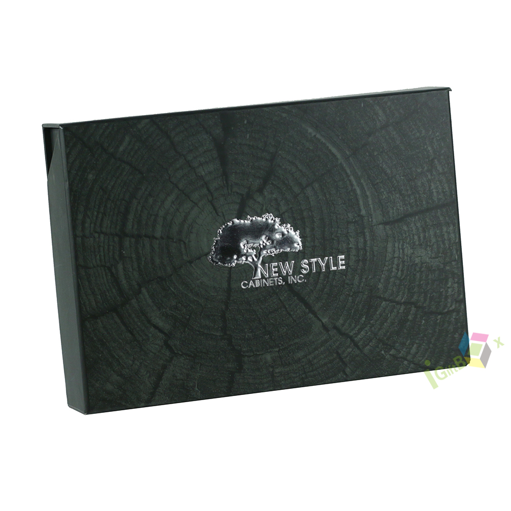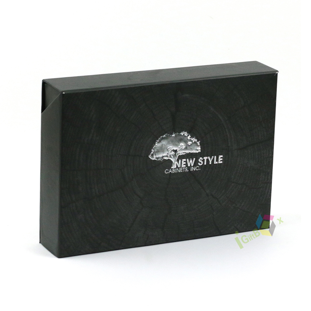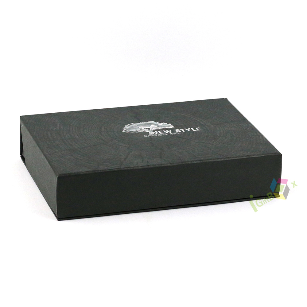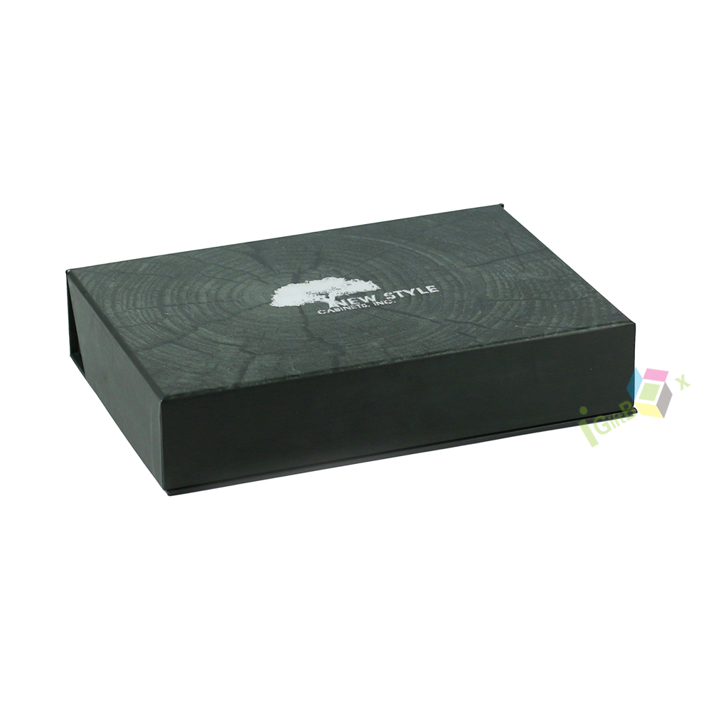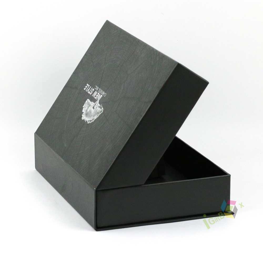 Premium matte black rigid lid-and-base gift box crafted from sturdy paperboard, featuring a sleek, non-reflective finish and crisp silver foil branding on the lid. The clean, minimalist design and deep black tone create a bold, sophisticated aesthetic, ideal for luxury cosmetics, jewelry, tech accessories, or corporate gifts. The box’s robust construction ensures durability and a premium unboxing experience, making it perfect for high-end retail presentation and special occasion gifting.