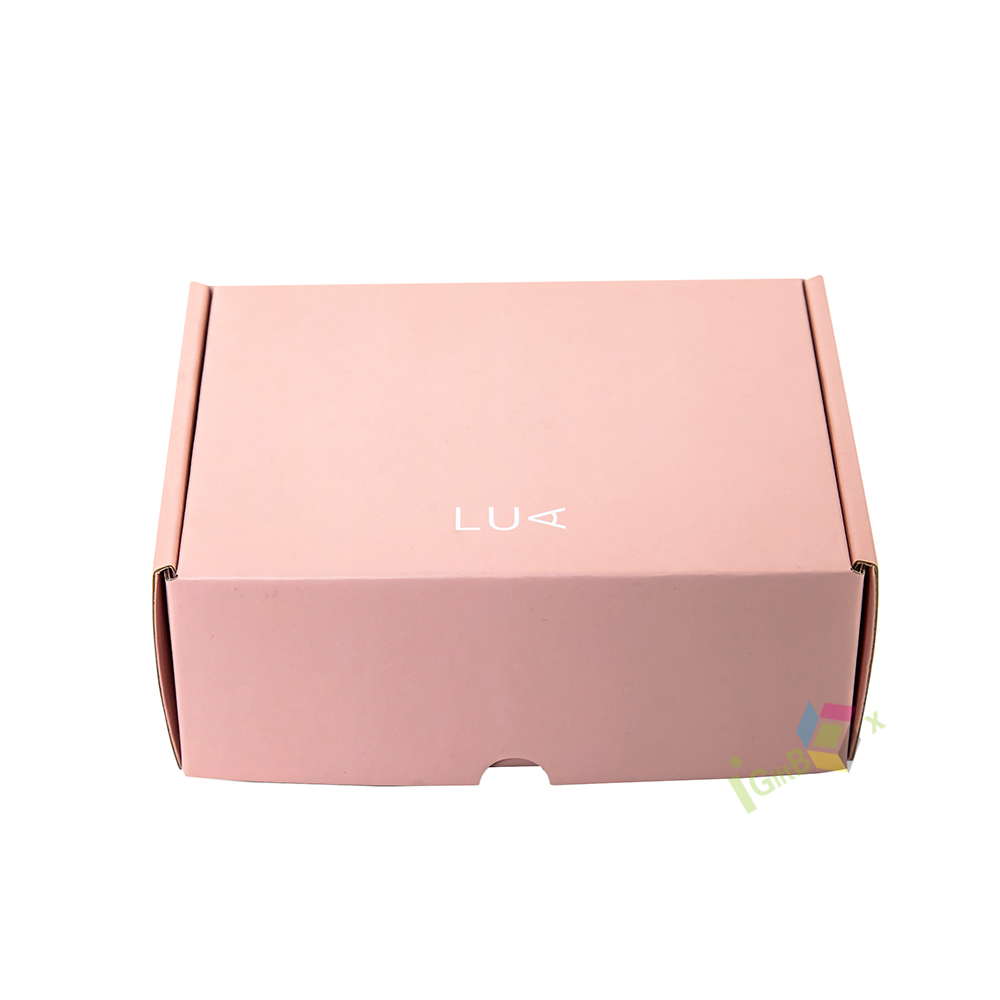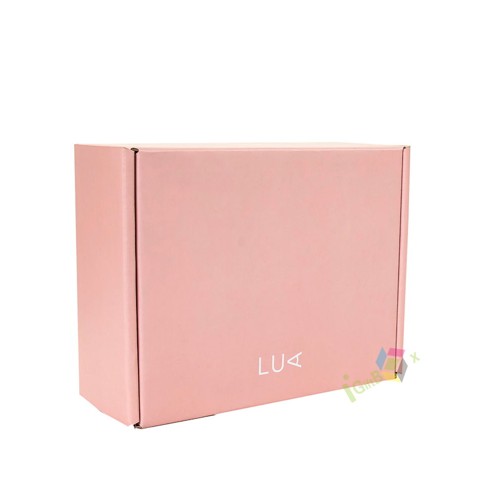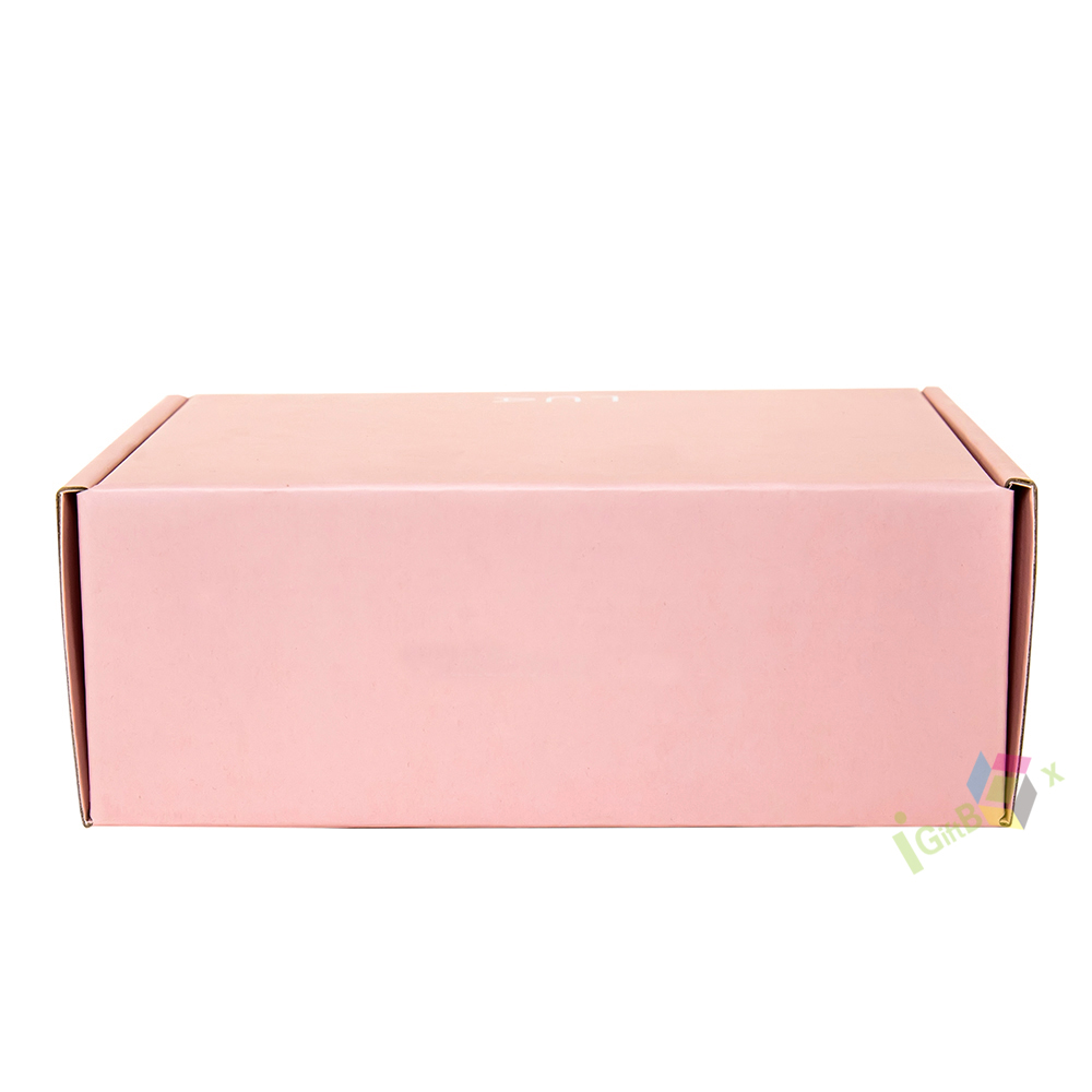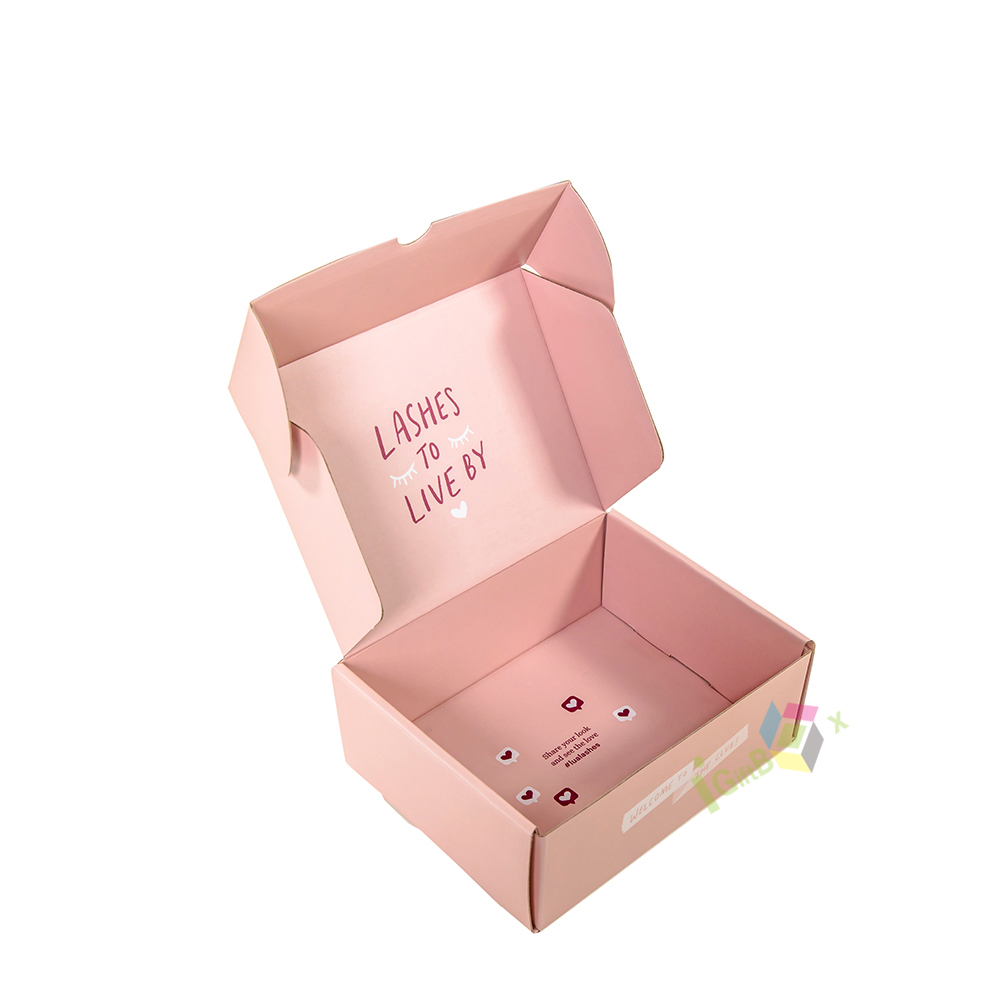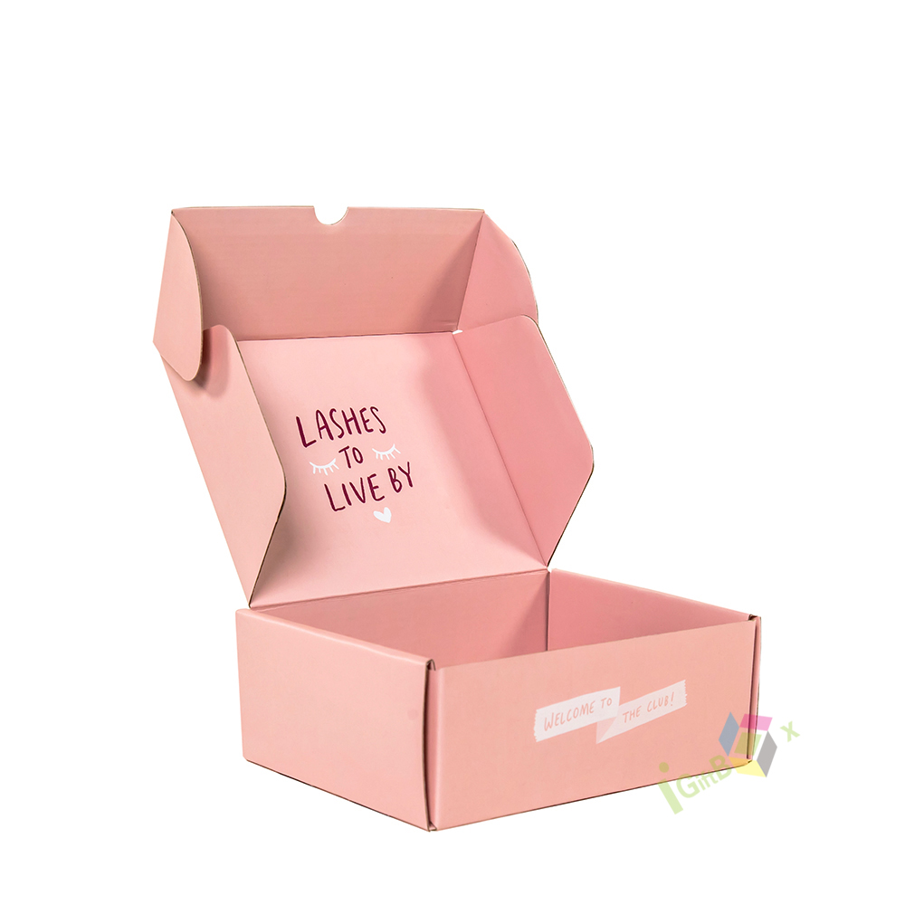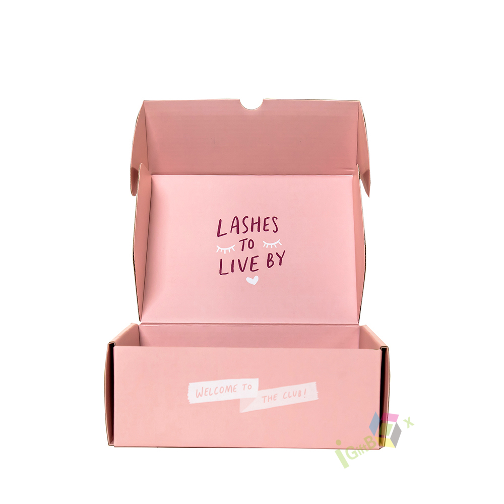 Soft pink corrugated mailer box with custom logo, ideal for beauty and lash product shipping. Crafted from sturdy, lightweight cardboard, this self-locking box provides reliable protection during transit while adding a branded, personalized touch. The smooth matte finish and vibrant pink color create a playful yet professional aesthetic, perfect for small businesses, beauty brands, and subscription services.