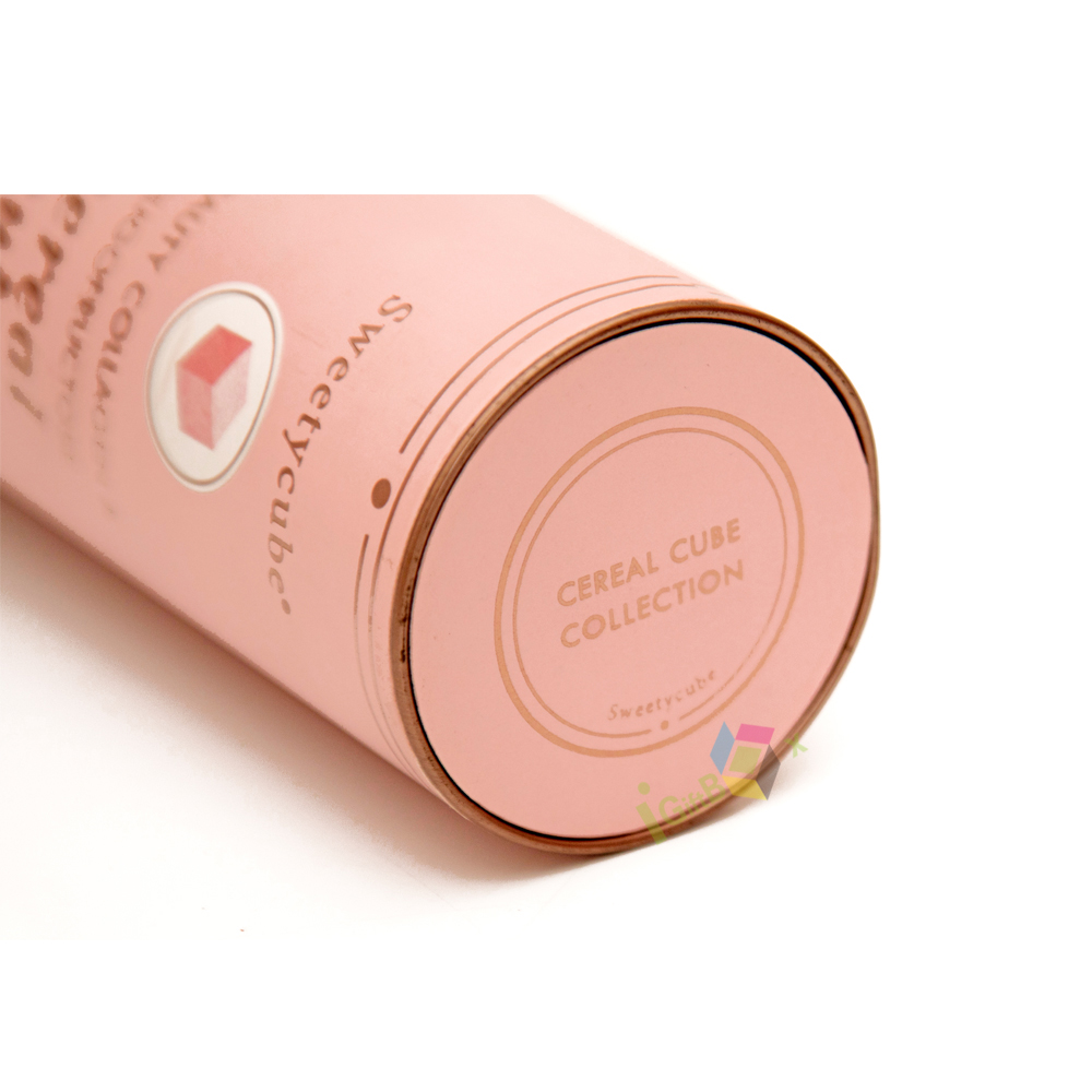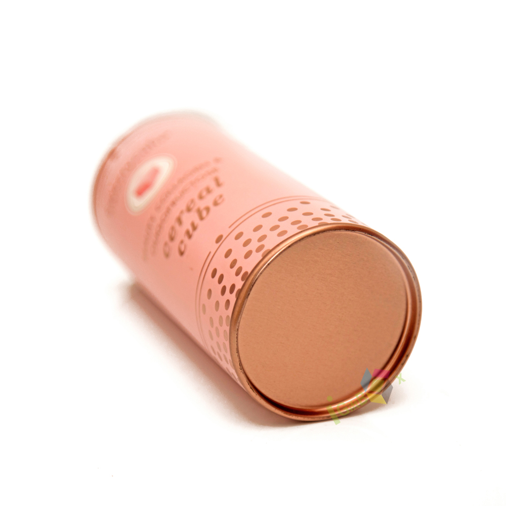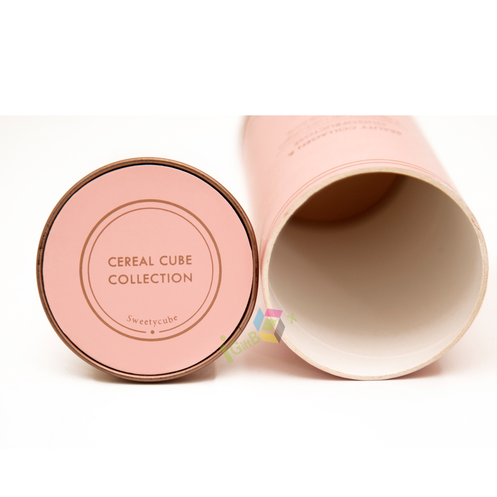 This soft pink cylinder paper tube packaging features elegant rose gold printed branding, including product text and a geometric logo, creating a feminine, high-end aesthetic ideal for cosmetics, skincare, or beauty tools. Crafted from sturdy, eco-friendly cardboard, it offers reliable protection for delicate items, while the push-on lid design ensures secure closure and easy access. The smooth matte pink exterior complements the rose gold print, adding a sophisticated touch. Perfect for retail beauty product packaging, gift sets, or brand displays, this paper tube combines practical functionality with a charming, premium look.