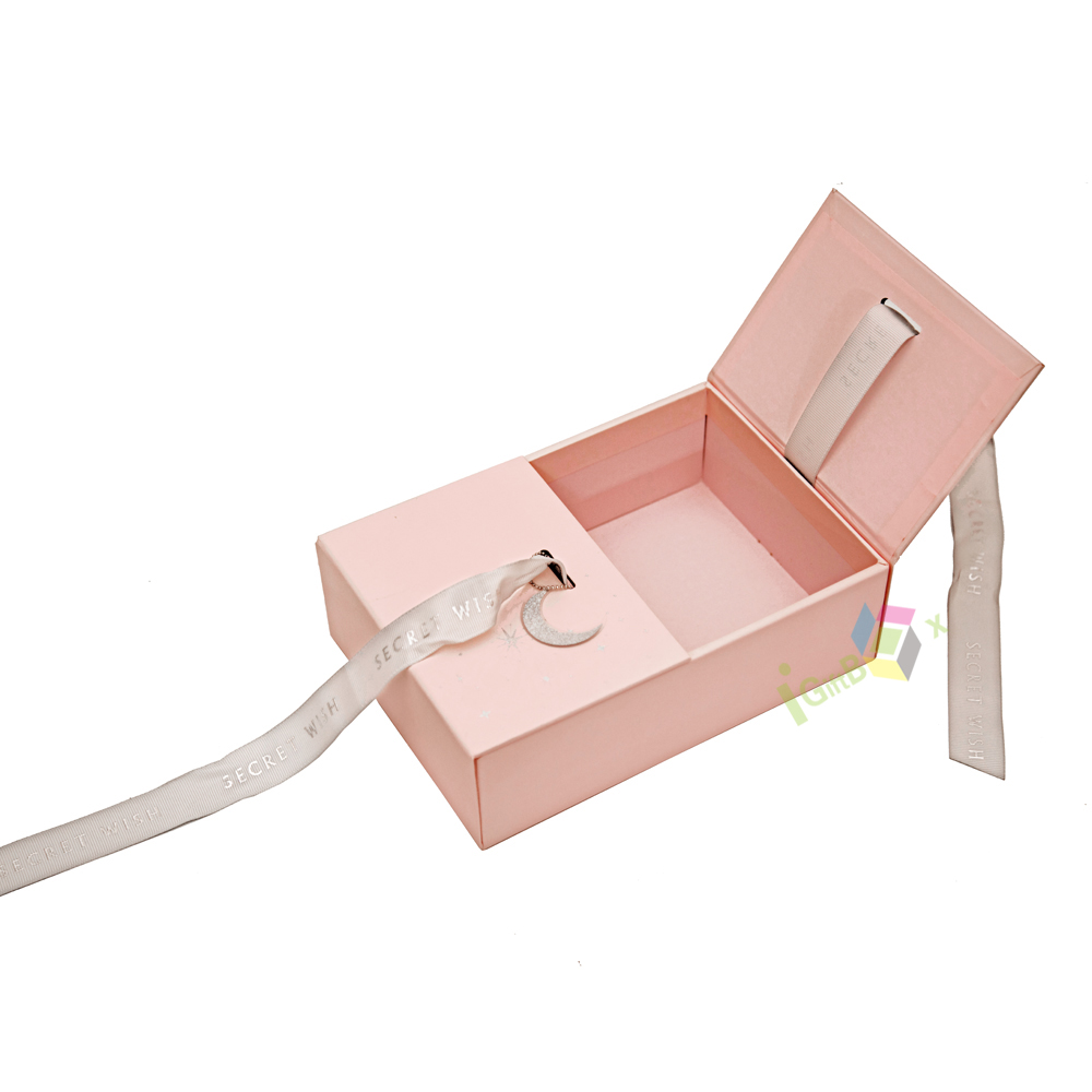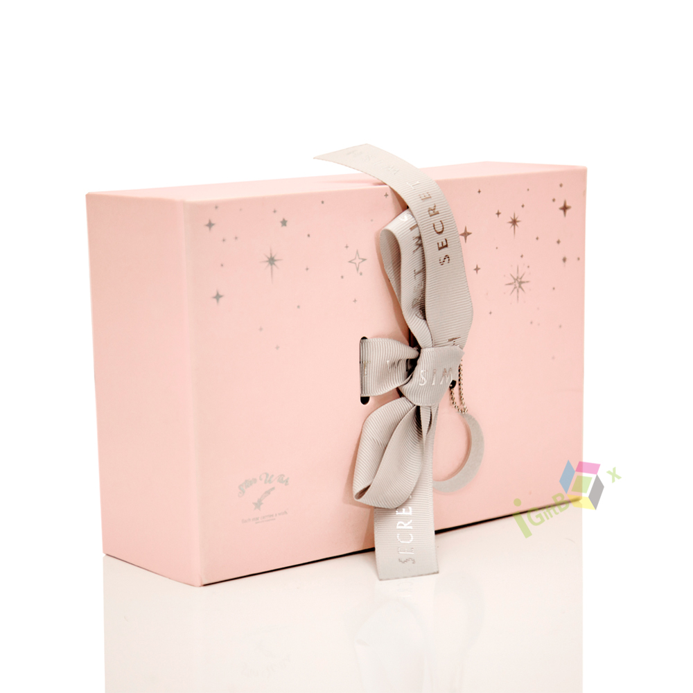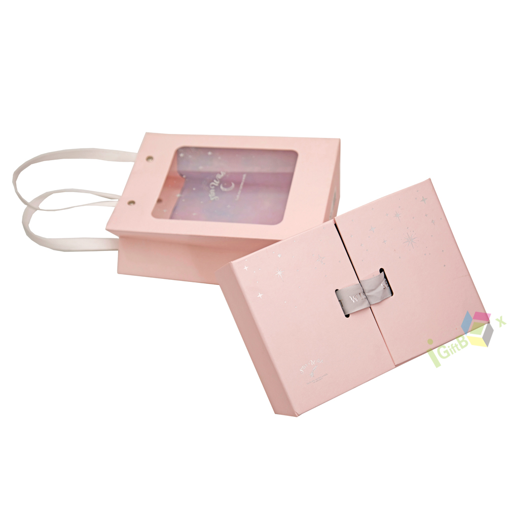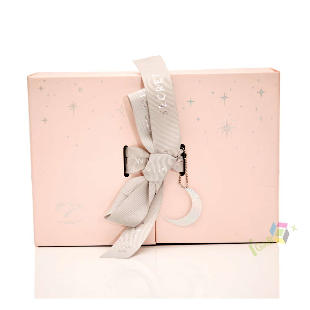 Elegant pink gift set featuring a double-door rigid gift box and a coordinating paper tote bag. The box is adorned with a delicate silver crescent moon charm and a long satin ribbon tied in a bow, accented with subtle starry details for a whimsical, premium finish. The matching bag features reinforced rope handles and a subtle brand emblem, completing the cohesive look. Ideal for high-end gifting, cosmetics, jewelry, or boutique retail, this set elevates the presentation for birthdays, anniversaries, and special occasions.