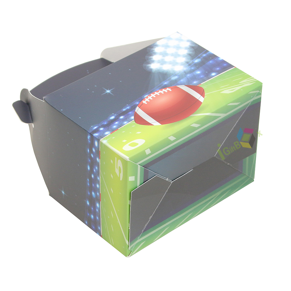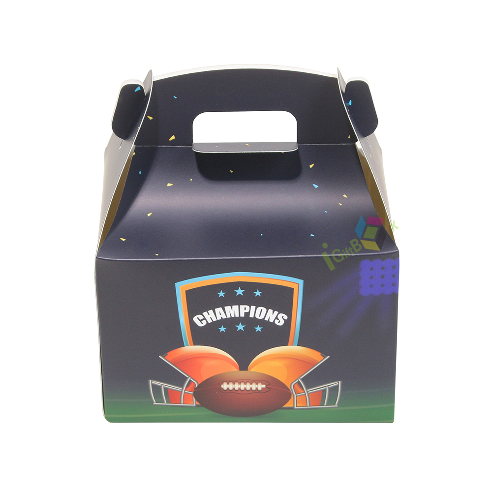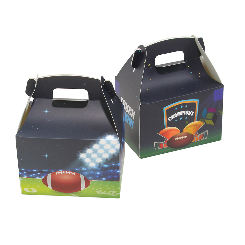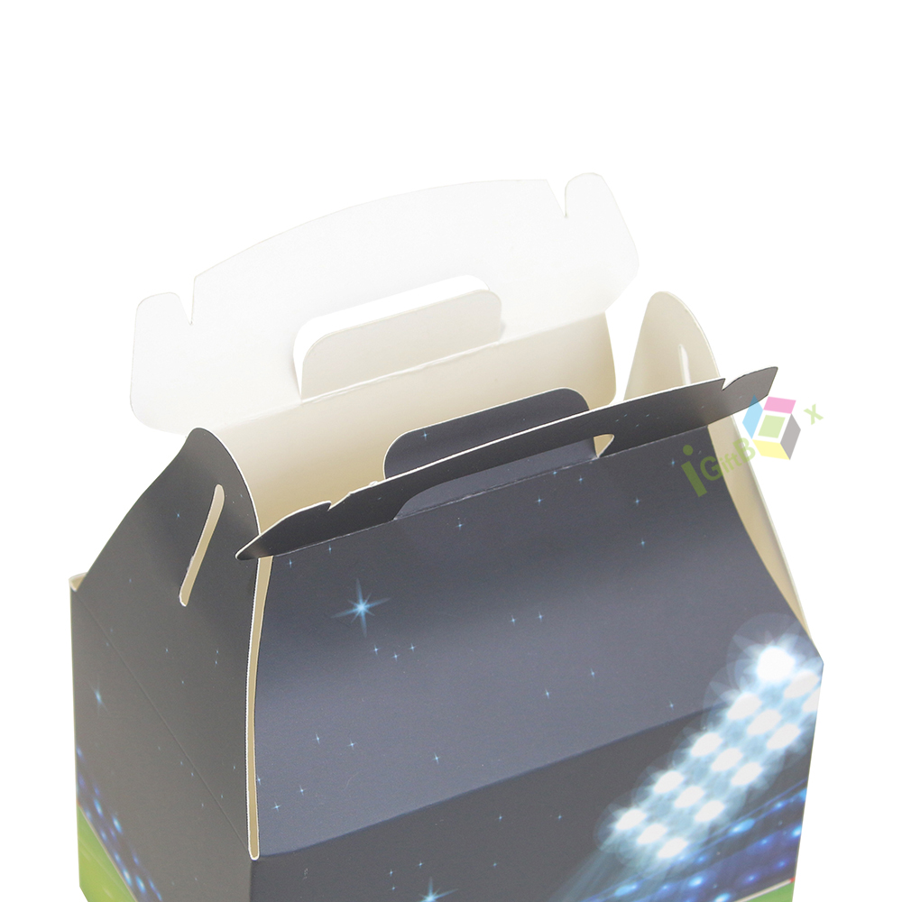 Portable handle gable box with custom theme printing, offering a festive packaging solution for chocolates and party favors.