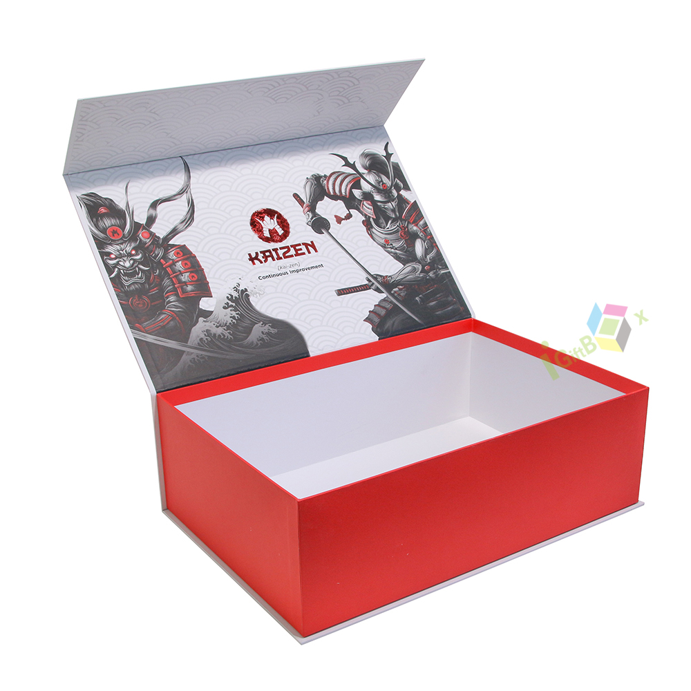 This premium rigid cardboard gift box combines robust protection with striking custom printing, featuring a bold red exterior and intricately designed interior lid artwork. Crafted from thick, durable rigid paperboard, it ensures exceptional sturdiness for high-value gifts, luxury items, or collectibles.