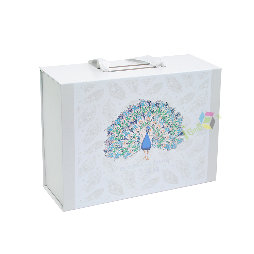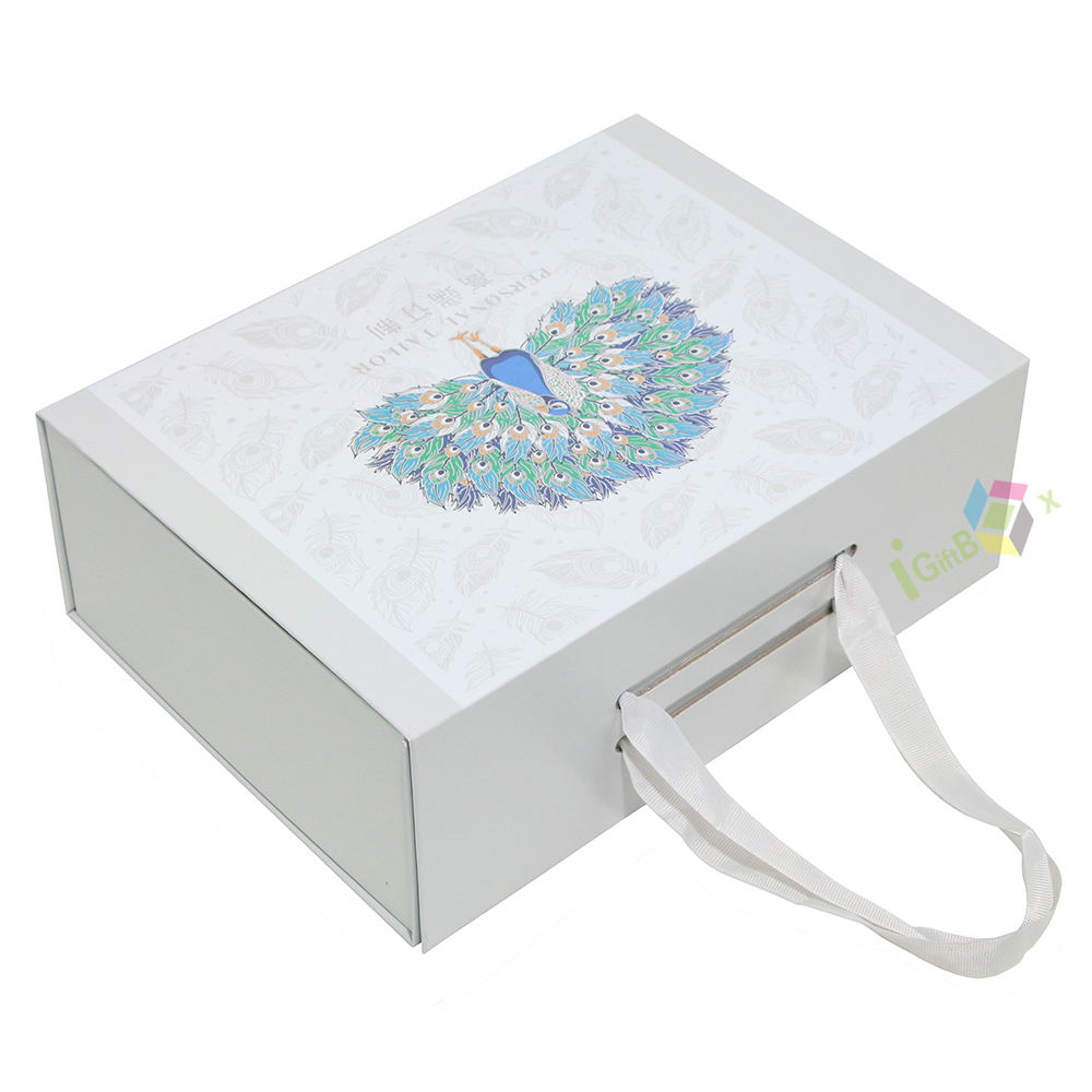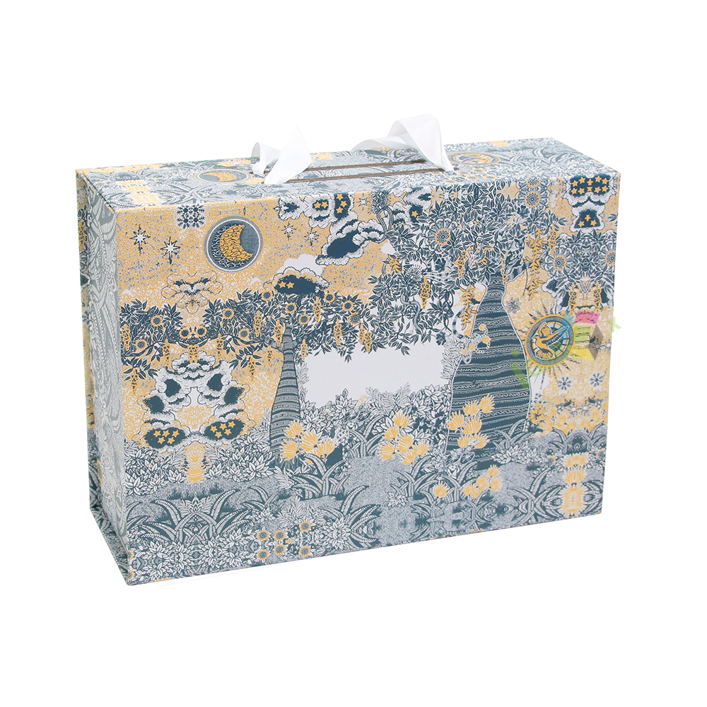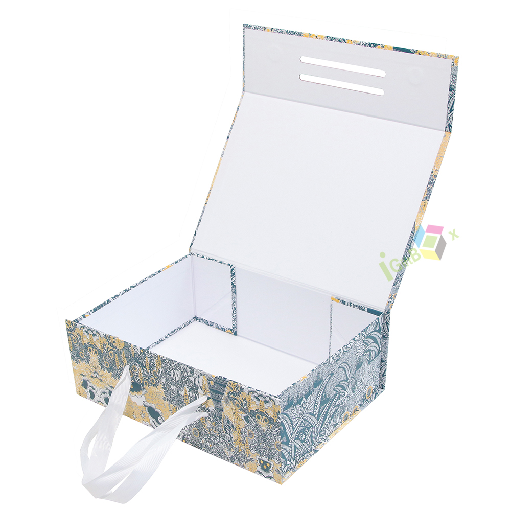 This custom printed collapsible gift box with handle features a foldable design, ideal for premium gifting and branded product packaging.