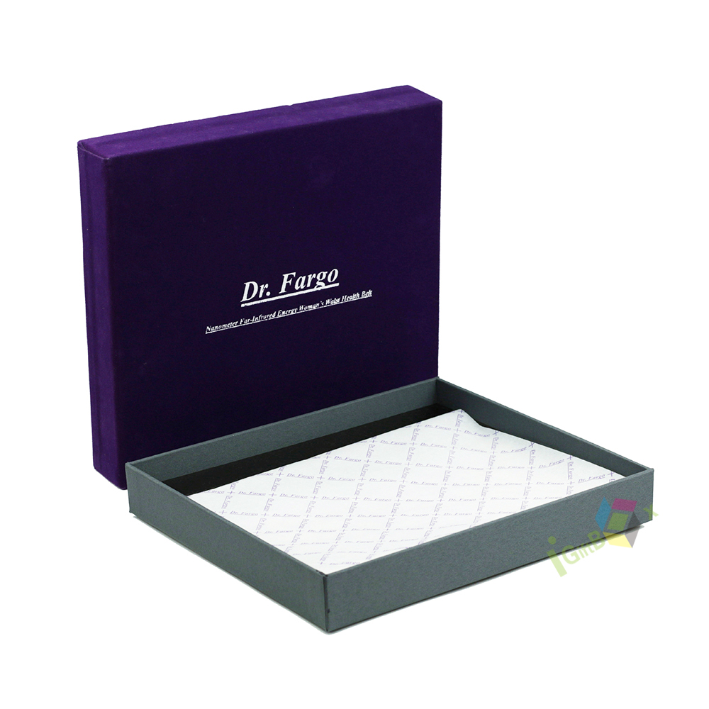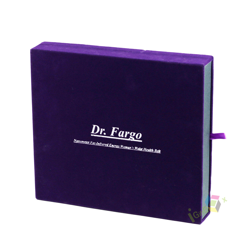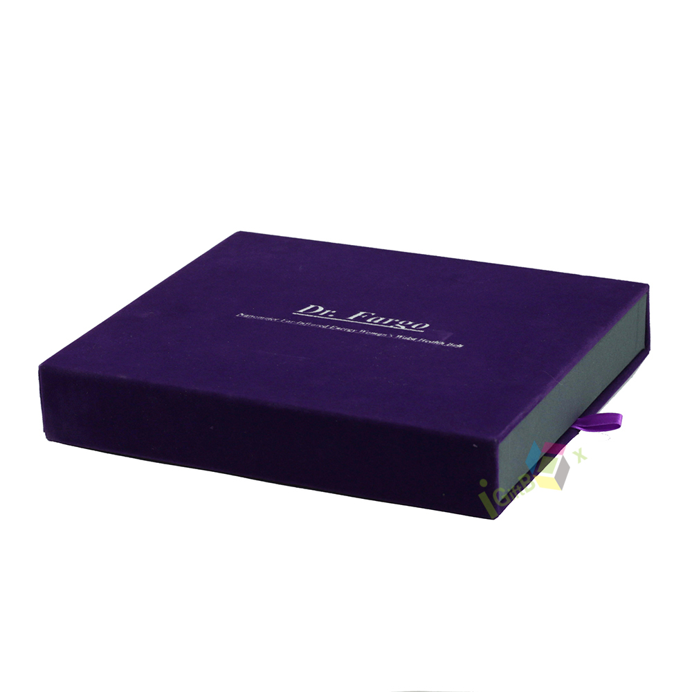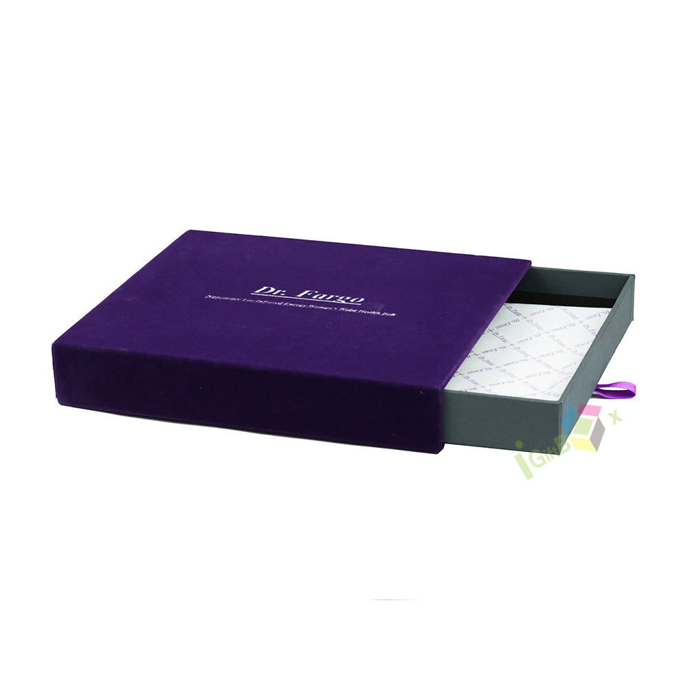Elegant slide-out drawer box crafted with a rich, deep purple velvet exterior and crisp custom logo printing. The smooth velvet finish adds a luxurious, tactile feel, while the purple ribbon pull ensures easy opening. Inside, the box features a clean, diamond-patterned white lining, ideal for protecting jewelry, cosmetics, or apparel items. The sturdy paperboard construction wrapped in velvet creates a premium, high-end aesthetic, perfect for luxury retail packaging, special occasion gifting, or branded product presentation.