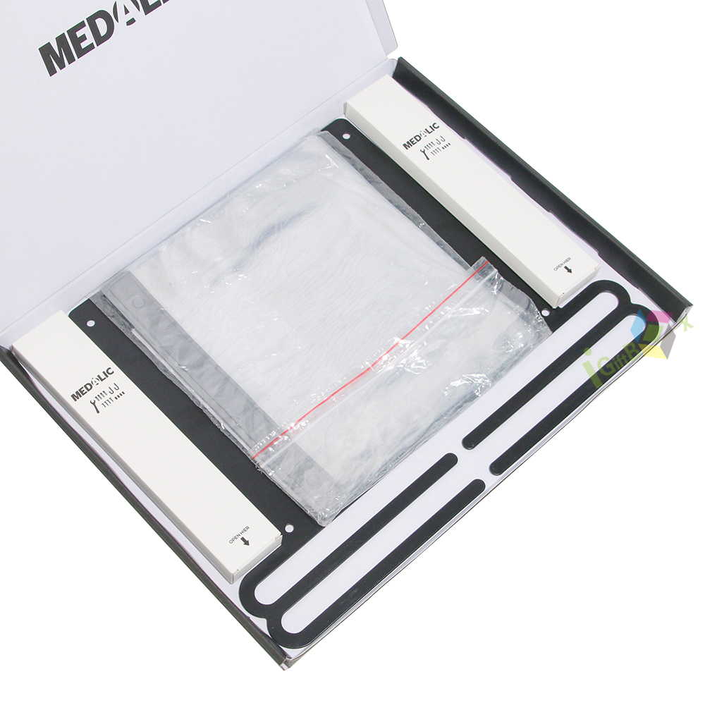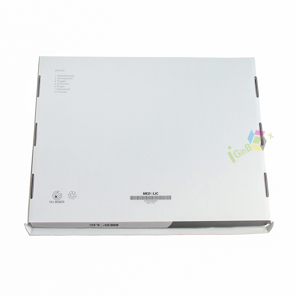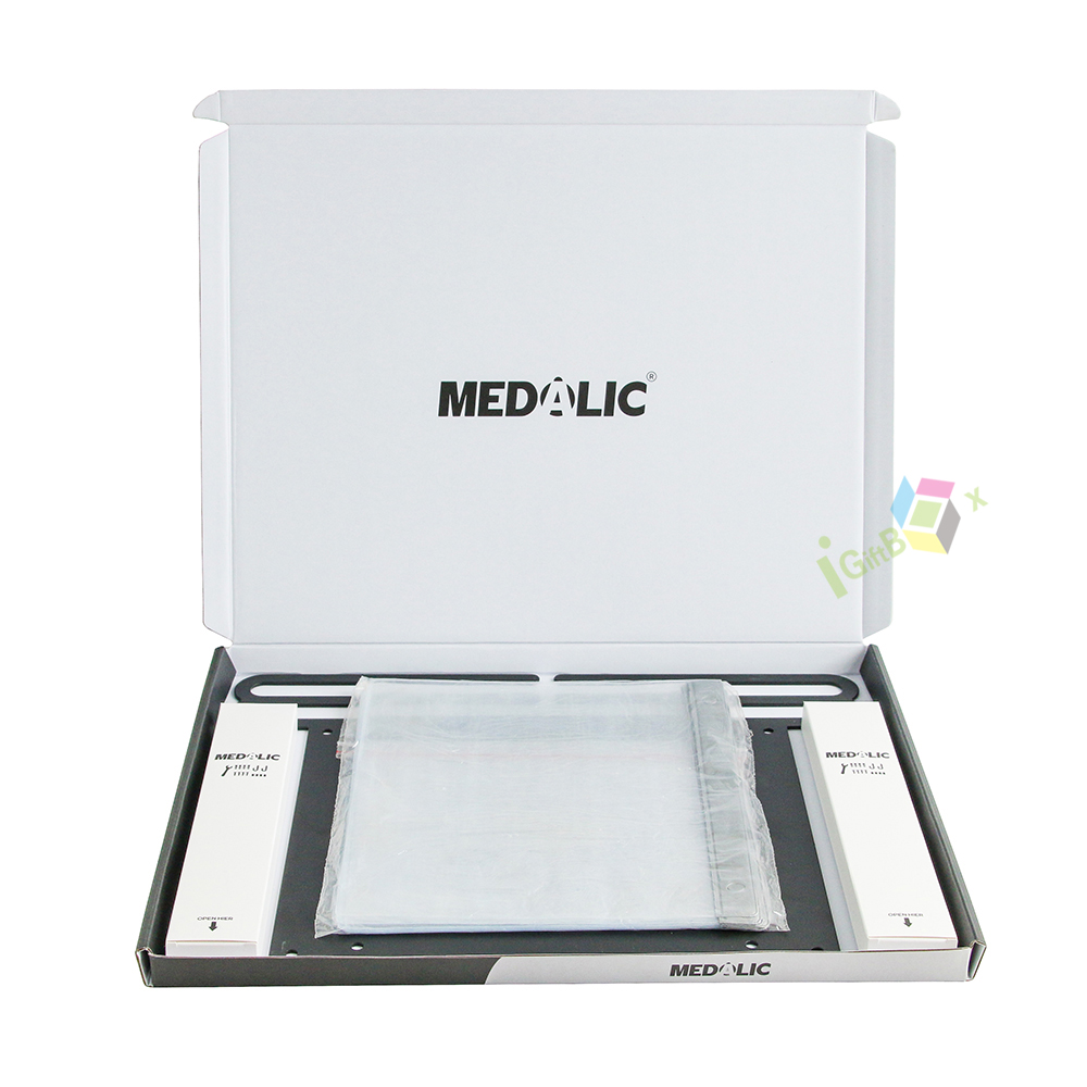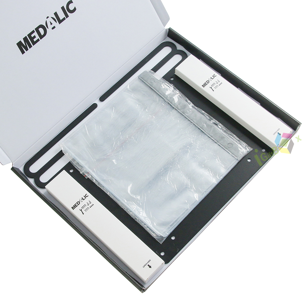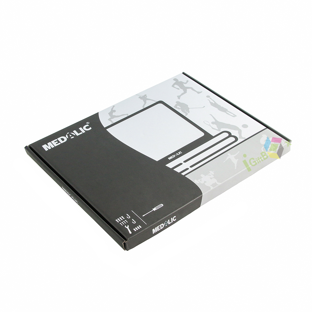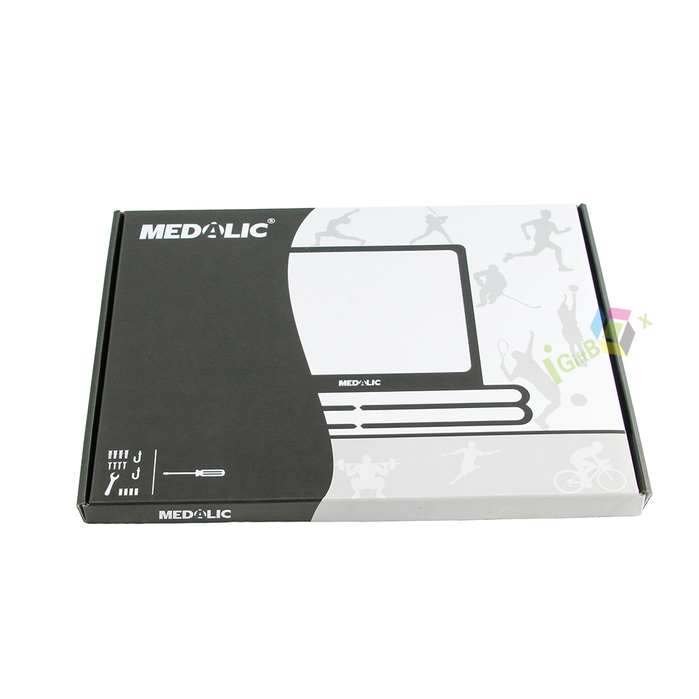 High-end rigid apparel packaging box with a sleek black-and-white color scheme, designed for premium clothing or textile products. Crafted from sturdy paperboard, it features a flip-top lid with printed brand name “MEDALIC” for clear branding. The interior includes a precision-cut foam insert to securely hold garments and accessories, preventing shifting during shipping. The minimalist, professional design conveys a medical or luxury aesthetic, ideal for high-quality apparel, linens, or medical textiles.