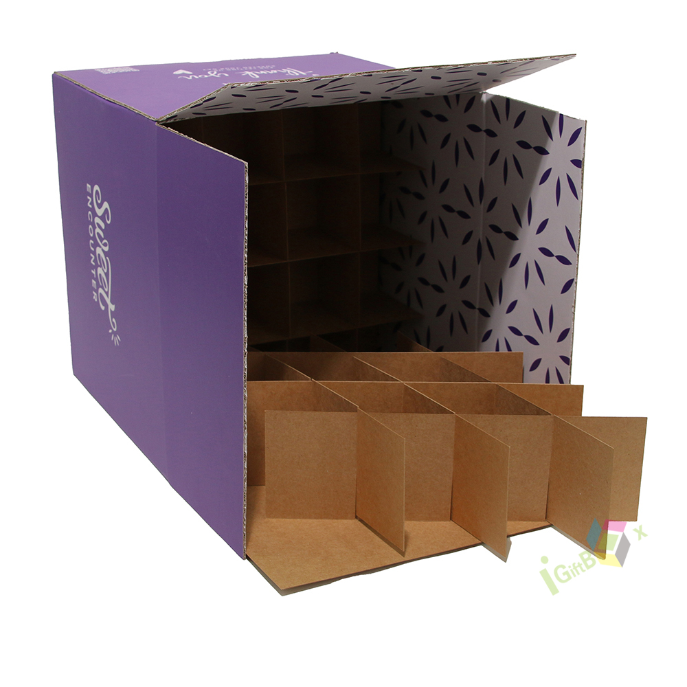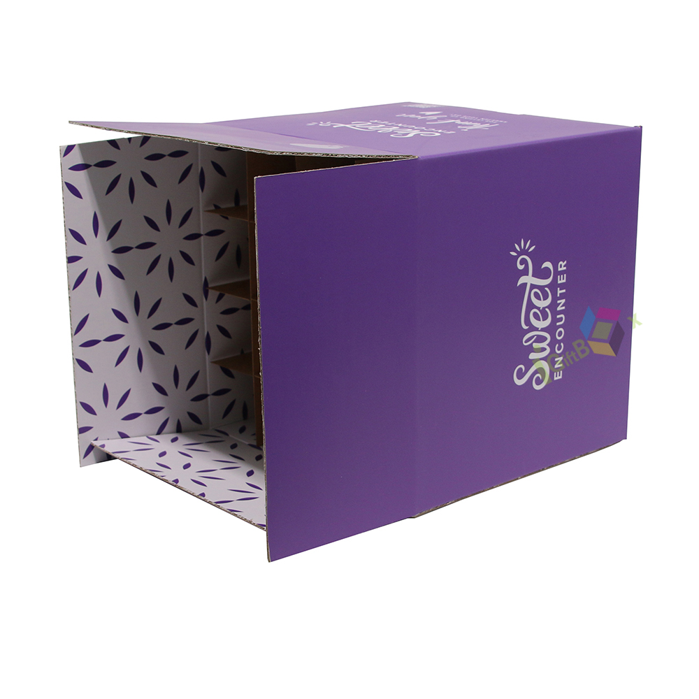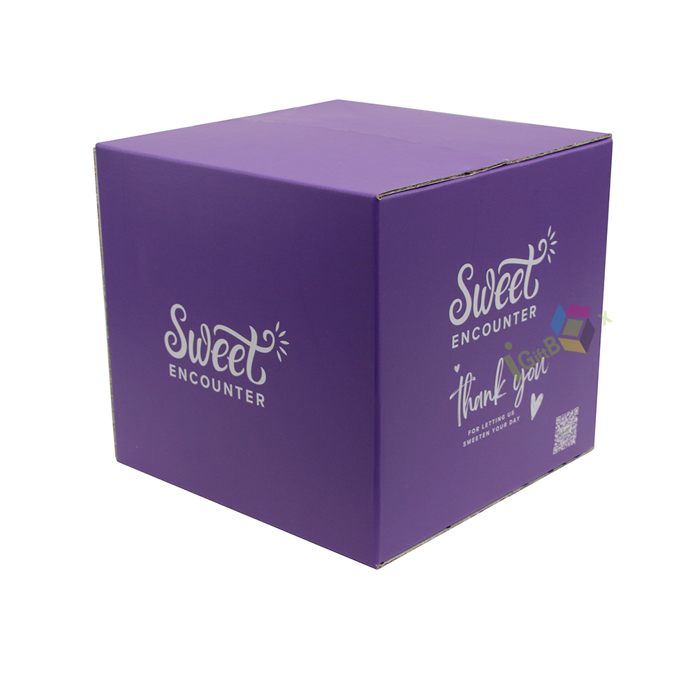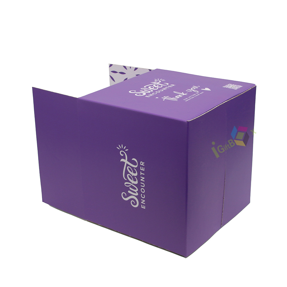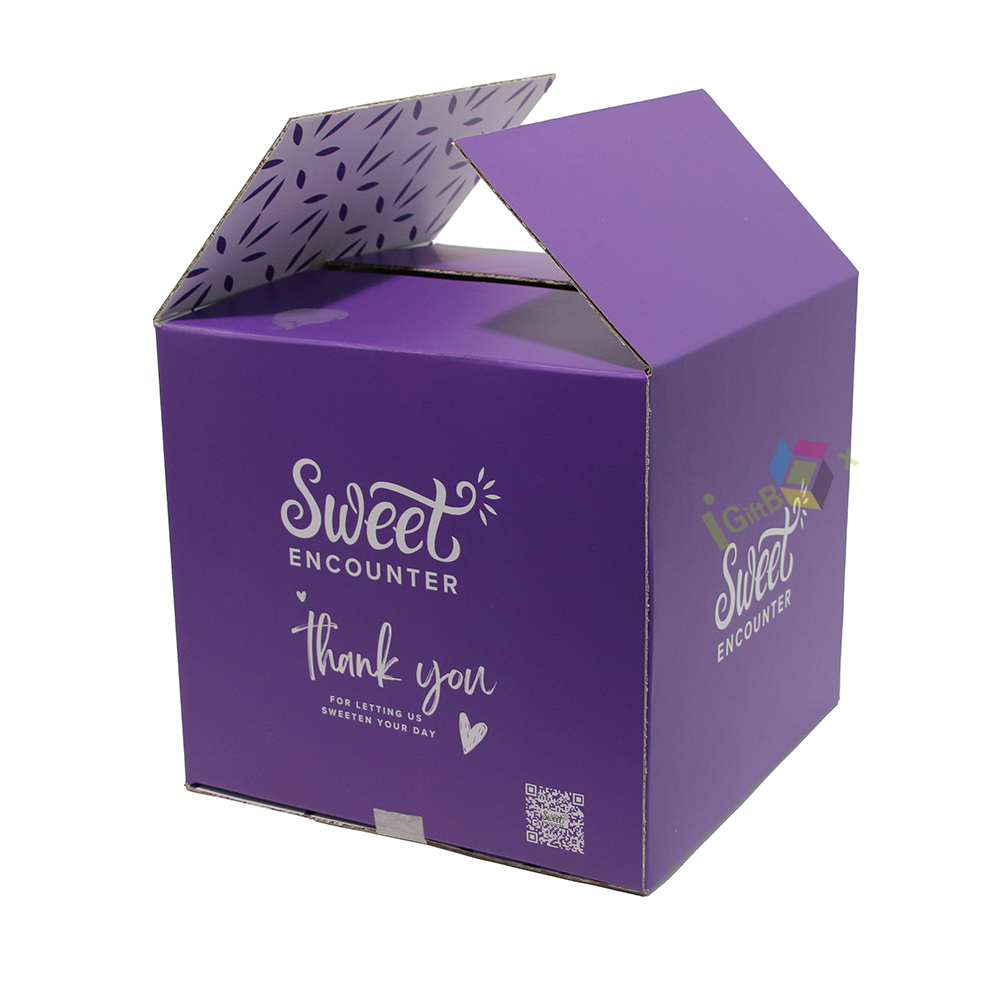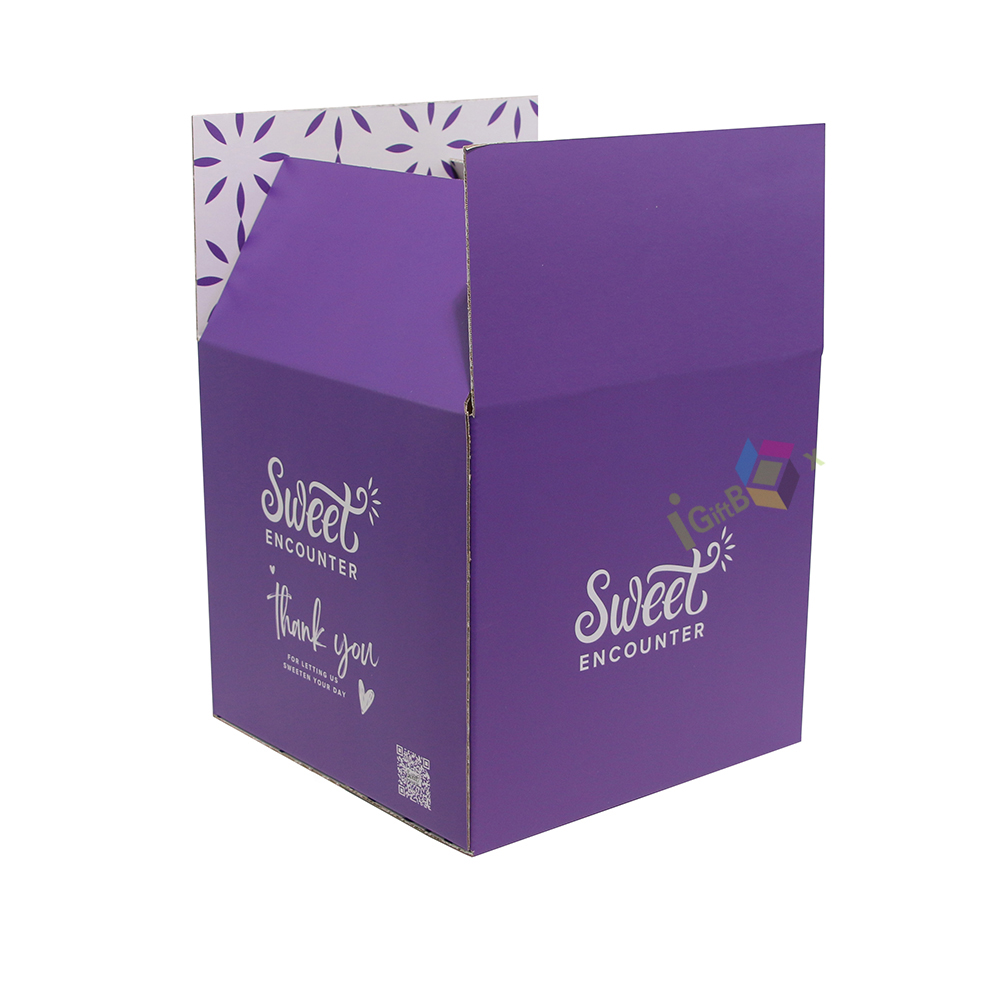 This vibrant matte purple cardboard packaging box features custom logo on the exterior, paired with decorative floral print on the interior lid. Crafted from sturdy corrugated cardboard, it offers reliable protection for products while delivering a warm, memorable unboxing experience. The foldable mailer-style design is ideal for small business gifting, treats, cosmetics, or retail products, combining eye-catching design with functional durability.