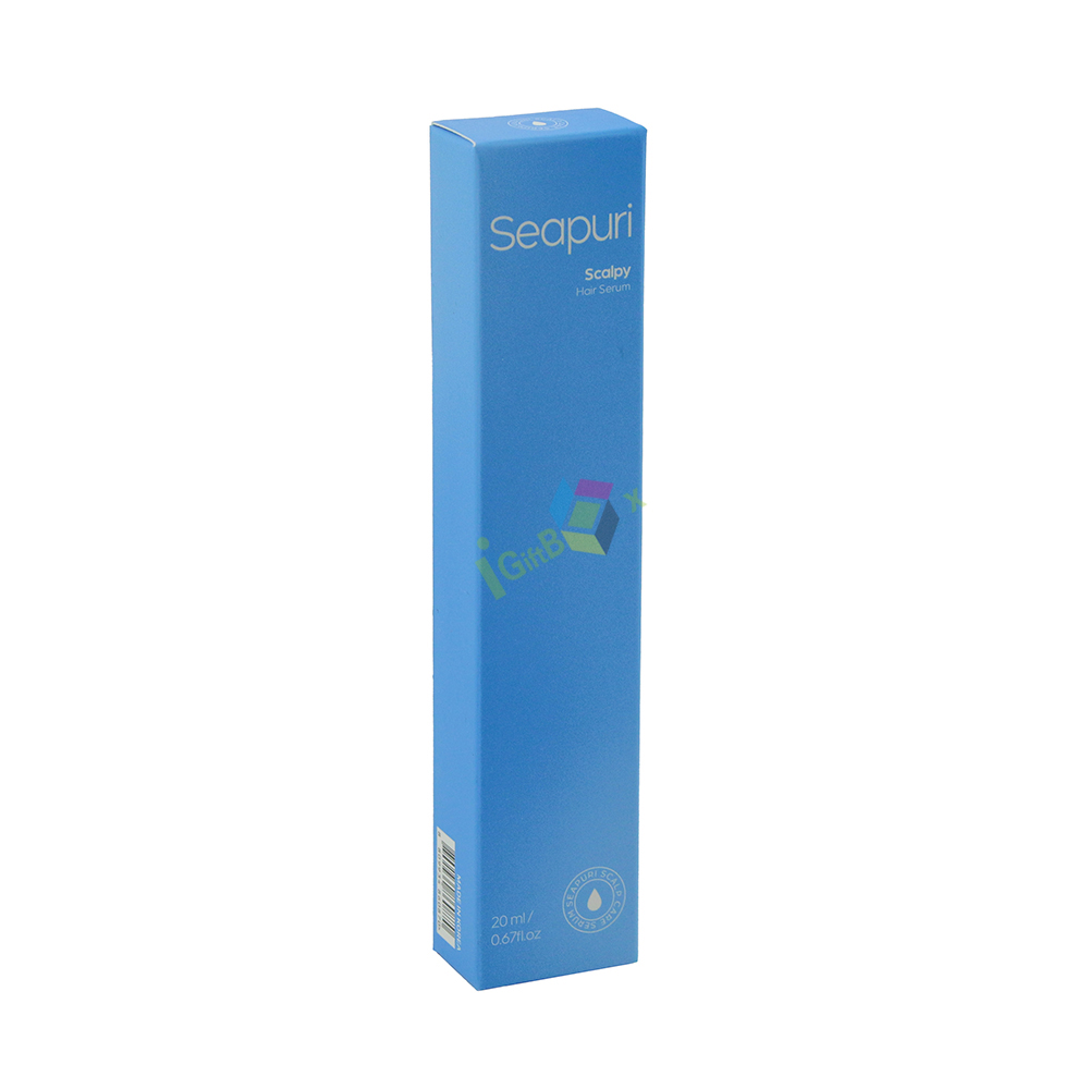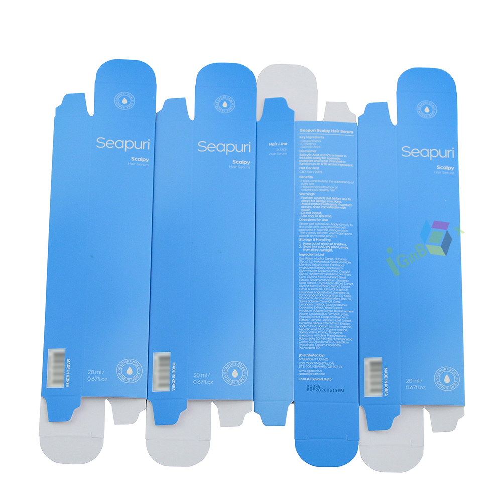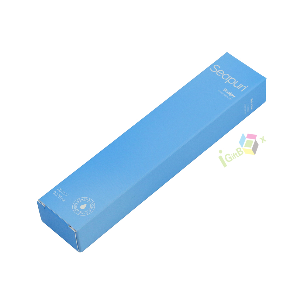 Straight tuck-end blue cardboard box with tall slim rectangular structure, offering secure protection and a sleek modern look for hair serum products.