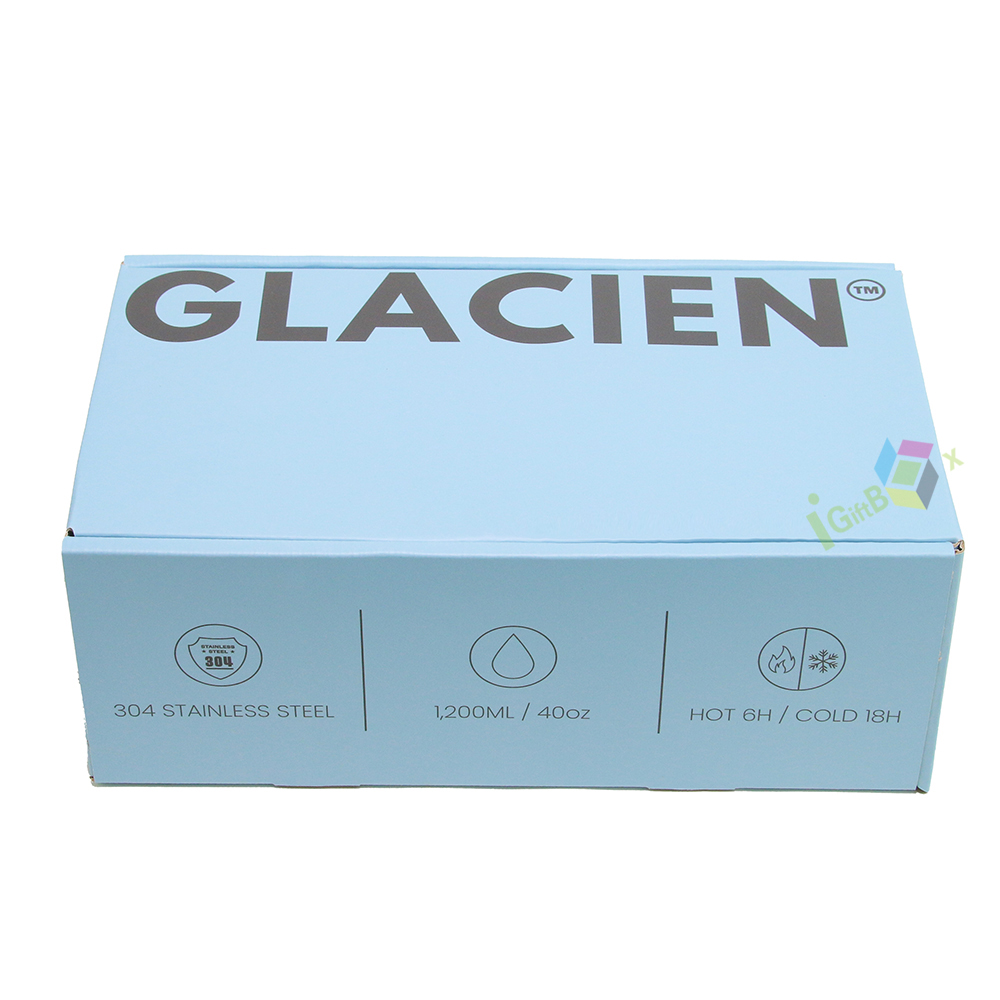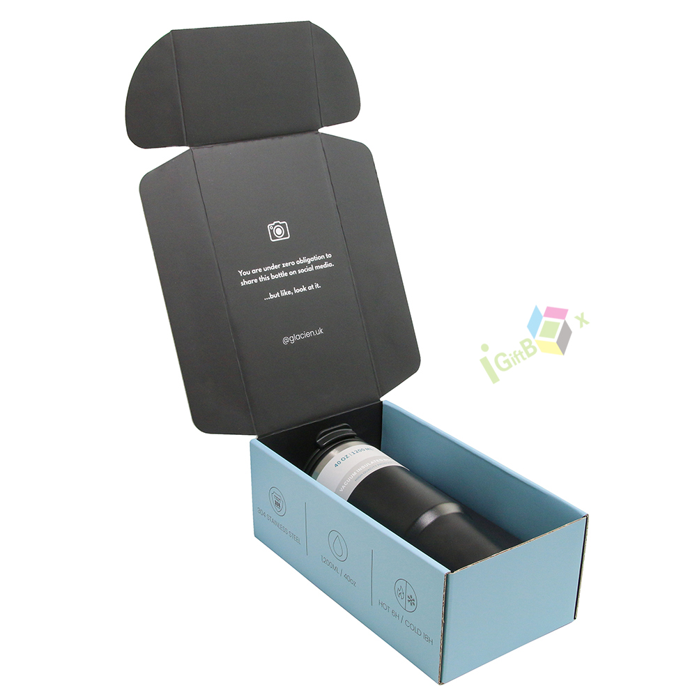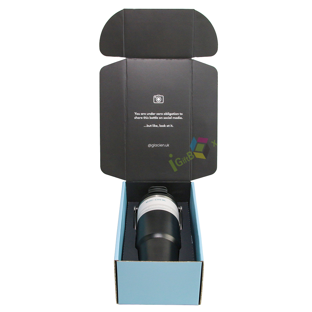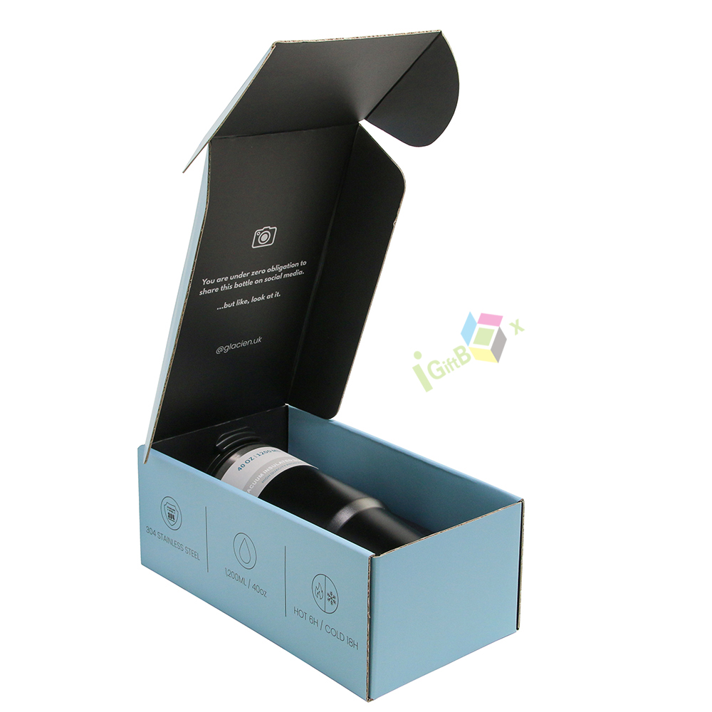 Light blue rigid bottle box with flip-top tuck-flap and UV printed metallic logo, offering secure bottle protection and a premium unboxing experience.
