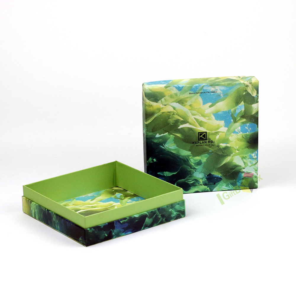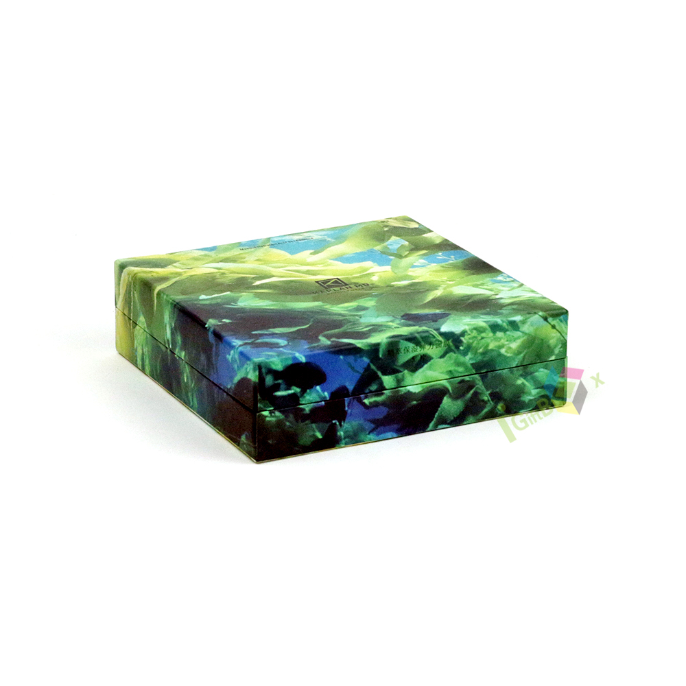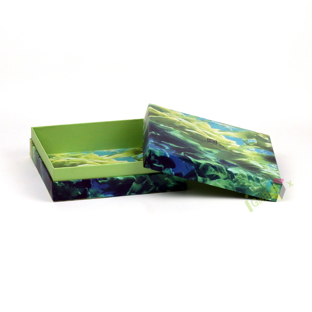 Eye-catching rigid lid-and-base gift box featuring a vibrant abstract marbled print in shades of green, blue, and yellow, paired with a fresh lime green interior. The bold, nature-inspired pattern creates a unique, artistic aesthetic, making this box perfect for premium gifts, cosmetics, accessories, or specialty retail products. Crafted from sturdy paperboard with a smooth, high-quality finish, it offers both durability and a striking presentation that stands out on shelves or during unboxing.